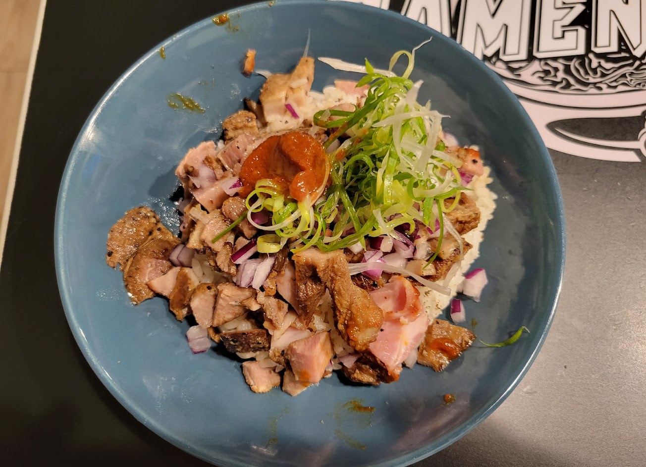 叉燒飯:????4燈獎 很大一碗,叉燒塊給的很足,飯也多,還有紫洋蔥解膩,但我覺得很不炙燒口感,且洋蔥太多有點搶味,美乃滋的比例很不錯。也許建議可以小碗一點,炙燒調味再改善,配菜比例再調整,也許更好吃!(目前我最愛柑橘魚水的豬叉燒飯,超愛?)