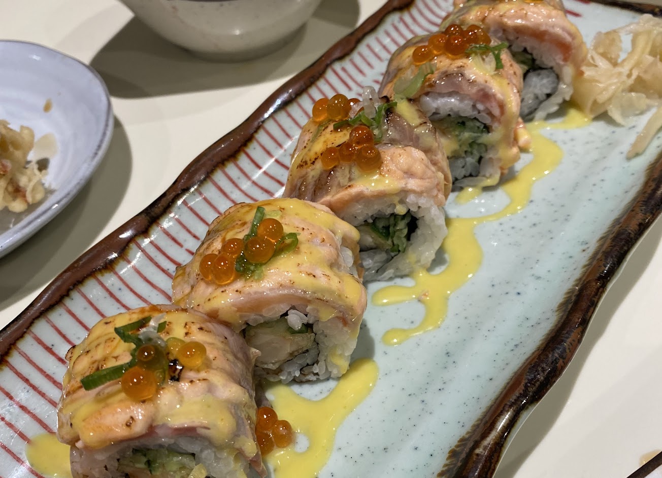 ◾炙燒鮭魚毛蟲捲($290):裡面包著炸蝦,上面有一些鮭魚卵,旁邊的醬汁有黃芥末,配著還挺搭的,我覺得吃起來有點開胃,飯的比例也不會太多。