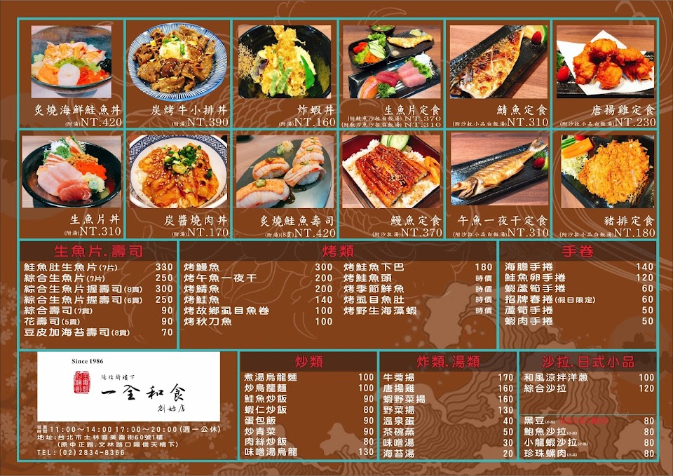 生魚片丼飯 鮭魚肚生魚片 綜合握壽司貫 海膽手卷 蝦廬筍手卷 炙燒魚飯 鰻魚蓋飯 豬肉丼 可樂 餅 炭醬燒肉丼 胡麻豆腐