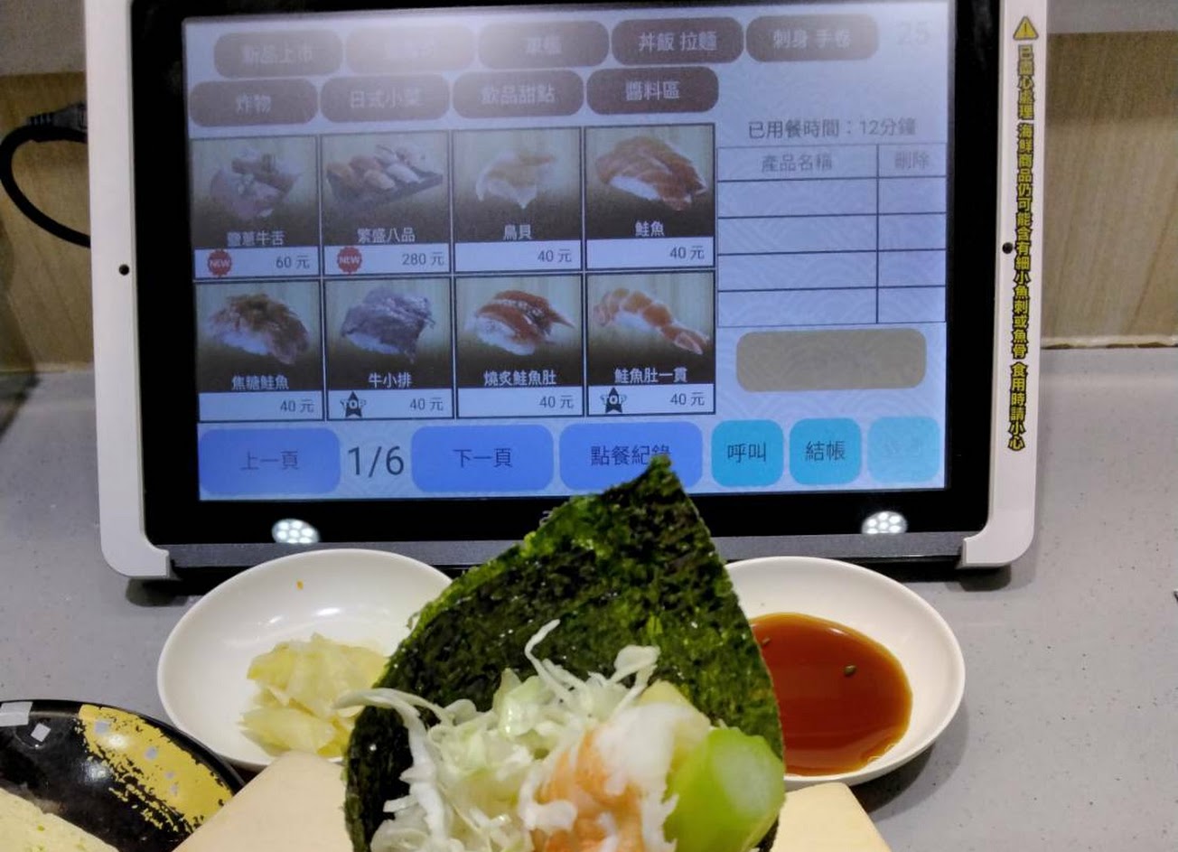 整體口味中上,有提供濕紙巾、沖泡茶、芥末、醬油、薑片,哇撒米是比較沒那麼嗆的那種,供應的茶偏苦,焦糖鮭魚的味道很特別? 使用pad點餐再送過來,座位有上下兩台新幹線運送,因此若同時段有較多人點餐,就需稍待,而平日未限時,假日視排隊人潮而定 …