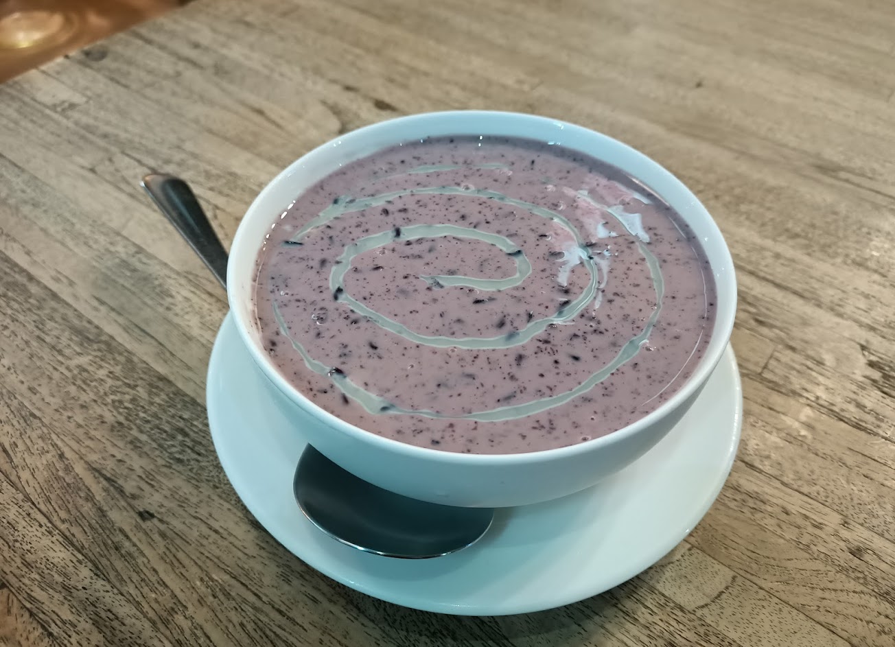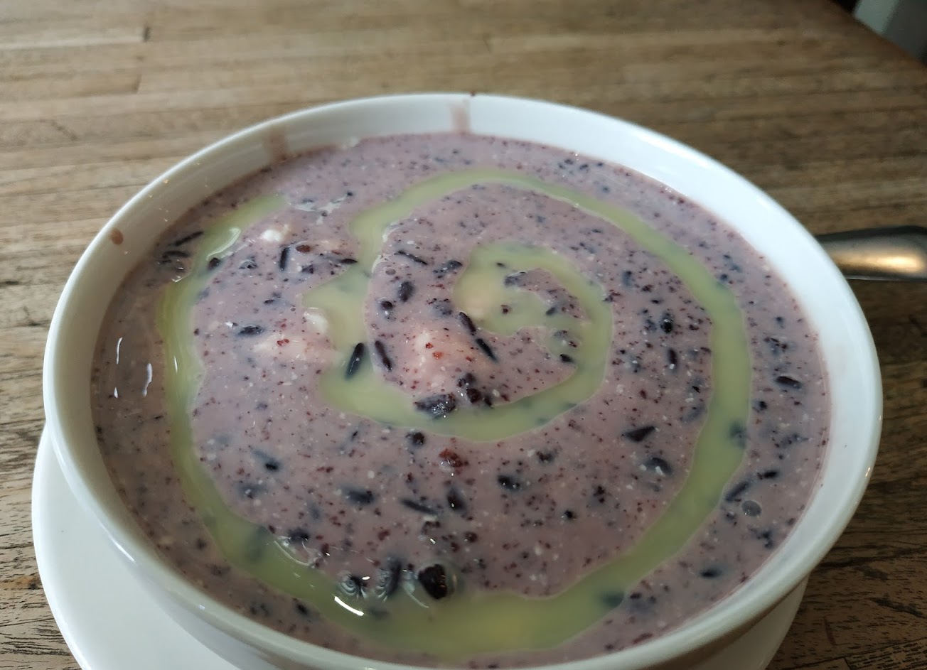 紫米加了牛奶,比例大概各半吧,變得不是黏稠的,淡淡的甜味,後韻吃出一點椰奶香味,覺得有亮點。