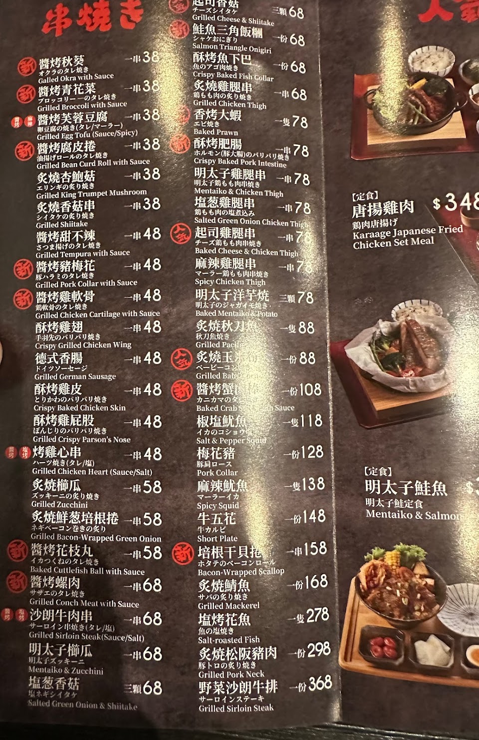 2023/10/19平日周四晚上六點進來,生意不錯大概半滿,位在高島屋百貨公司12樓氣氛不錯,進來第一印象就是人手不足,結帳+送餐好像只有一個服務人員,先等了很久送完餐才來招呼入座。 回到餐點本身,其實價格與大部分的居酒屋串燒差不多,並不貴,而且上菜非常快(如果吃比較慢的話,可能會放到涼掉,適合吃飯速度快的人來)點了串燒組合$368,可以從13個品項選不重複的7種, 比較推薦:酥烤雞皮,炙燒杏鮑菇,炙燒秋刀魚,炙燒櫛瓜,炙燒香菇串。還單點了明太子洋芋燒$78還不錯 不推薦:炙燒雞腿(太小份),醬烤甜不辣(很乾,沒味道)。 串燒整體而言就是連鎖餐廳標準化製作的感覺,不會到不好吃,但跟同價位同類型的餐廳比少了點精彩與技術的感覺。 套餐點了紅咖哩豬排定食$338:其實還不錯,就是標準連鎖餐廳日式咖哩,有番茄玉米筍跟白花椰菜,豬排本身炸的比較乾,皮不厚,放在咖哩裡面剛好,小菜味道普通,因為白飯不能續所以咖哩醬會用不完。 套餐可加$78點一份串燒跟小菜,小菜選胡麻黃瓜,味道很普通有點太油膩而且不夠冰。 內用有甜飲料紅茶冬瓜茶自助,並不是菜單上寫的檸檬水,自助的味噌湯還不錯,料算豐富。另外五星評價有送串燒,還蠻大方的,可能是這樣所以評價比較高分(當下是4.9分,接近3000評論) 結帳時也是等了一陣子,然後服務人員把送到一半的餐先放在一邊先幫我結帳,可能平日人手真的比較不足… 服務 內用 餐點類型 晚餐 平均每人消費金額 $600-800 餐點:2 服務:2 氣氛:3 建議的餐點 明太子洋芋燒 炙燒香菇串