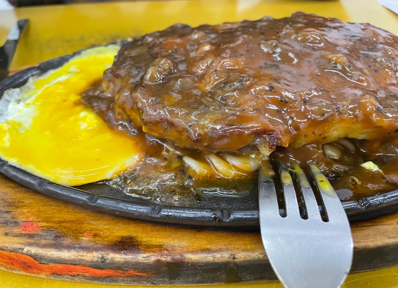 牛排+魚排,推薦老饕務必點雙拼口味,魚排煎的酥香,牛排大塊搭配台式A1梅林醬,來士林夜市必吃美食。