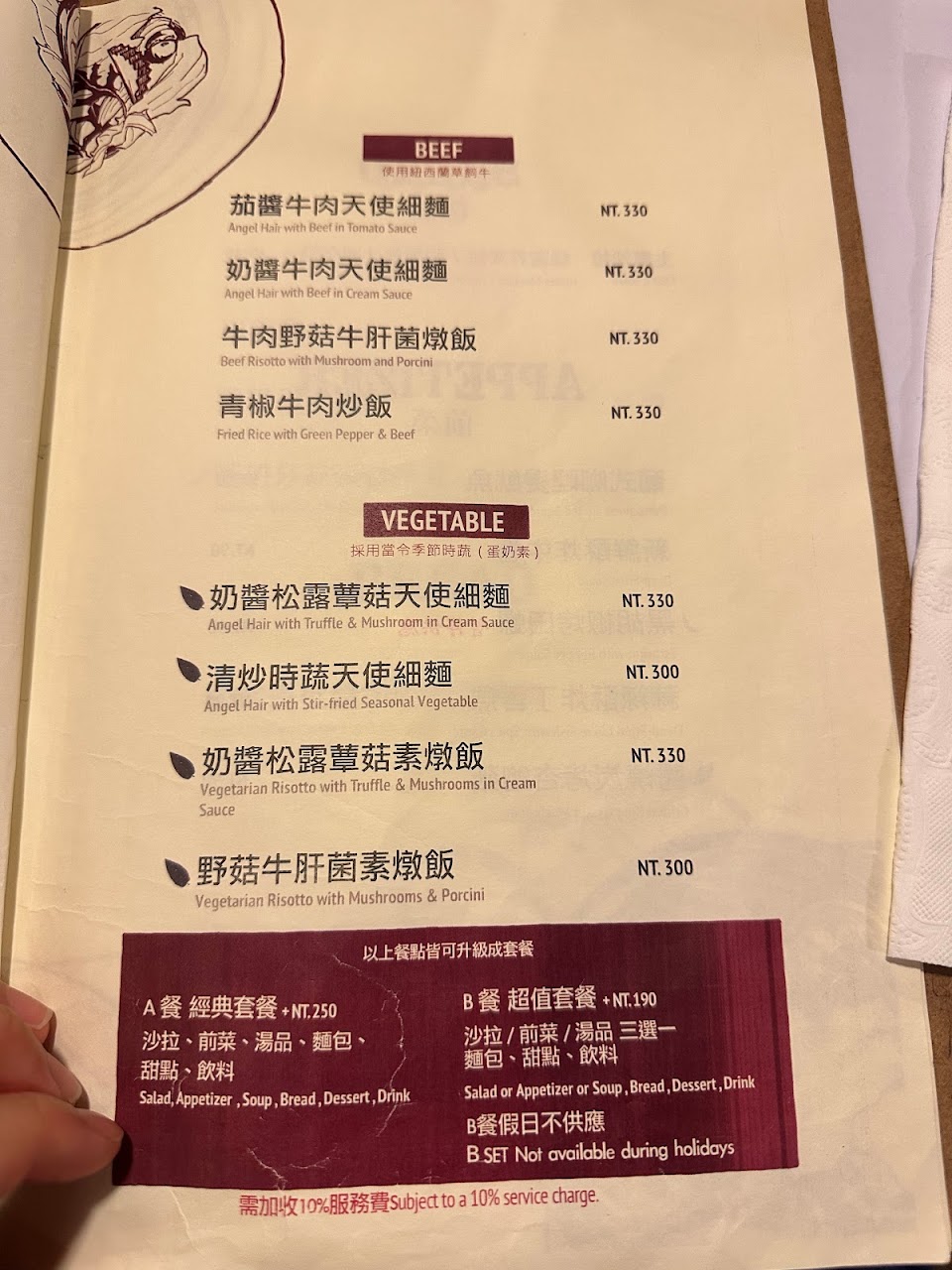 整體是推薦的,我們三人點了三個主餐+兩個A套餐,吃的很飽~ 餐點:5 服務:4 氣氛:4