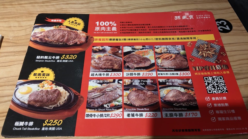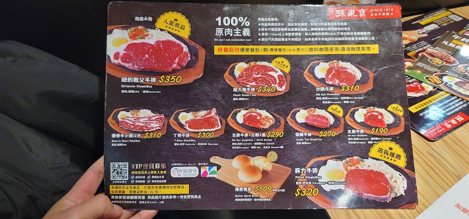 雖然孫東寶近年漲不少, 但還算平價. 肉質不錯, 口感佳很厚實. 少數有免費冰淇淋的分店, 這點就是加分. 早點來人不多, 可以悠閒用餐. 如果再有免費咖啡就更讚了. 餐點:4 服務:4 氣氛:4