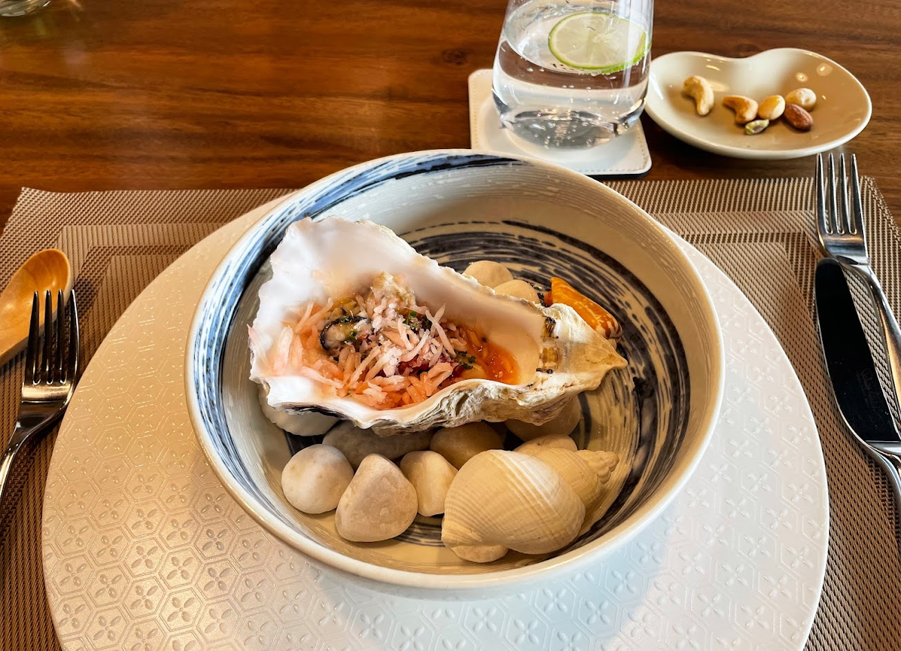 我得說每道都意外非常好吃,而最令人印象深刻的有三道,一個是作為開頭主打的半熟生蠔,搭上清爽的酸味佐料,一口完全將海的鮮味包覆在口中!而作為第三道的鴨肝飯同樣驚人,溫煦的飯上搭配微熱的鴨肝,一股油香與綿密感立馬席捲舌頭,但主廚在料理時將膩感處理的非常好,白飯與其他小佐料壓下了可能的膩口,只讓人想一口一口吃完!最後是主餐選擇的和牛排,點和牛排時我其實滿猶豫的,因為過往的經驗和牛牛排都會過於膩,一兩口就吃不下了,一直比較喜歡和牛作為燒肉,但Podium 將牛排處理的非常細緻,感覺是先醃過或用了特別的醬汁,獨有的醬汁鹹味包覆上牛排,恰好的緩解了和牛的膩口,搭上旁邊的小蔬菜佐料,讓人可以盡情的吃完它!