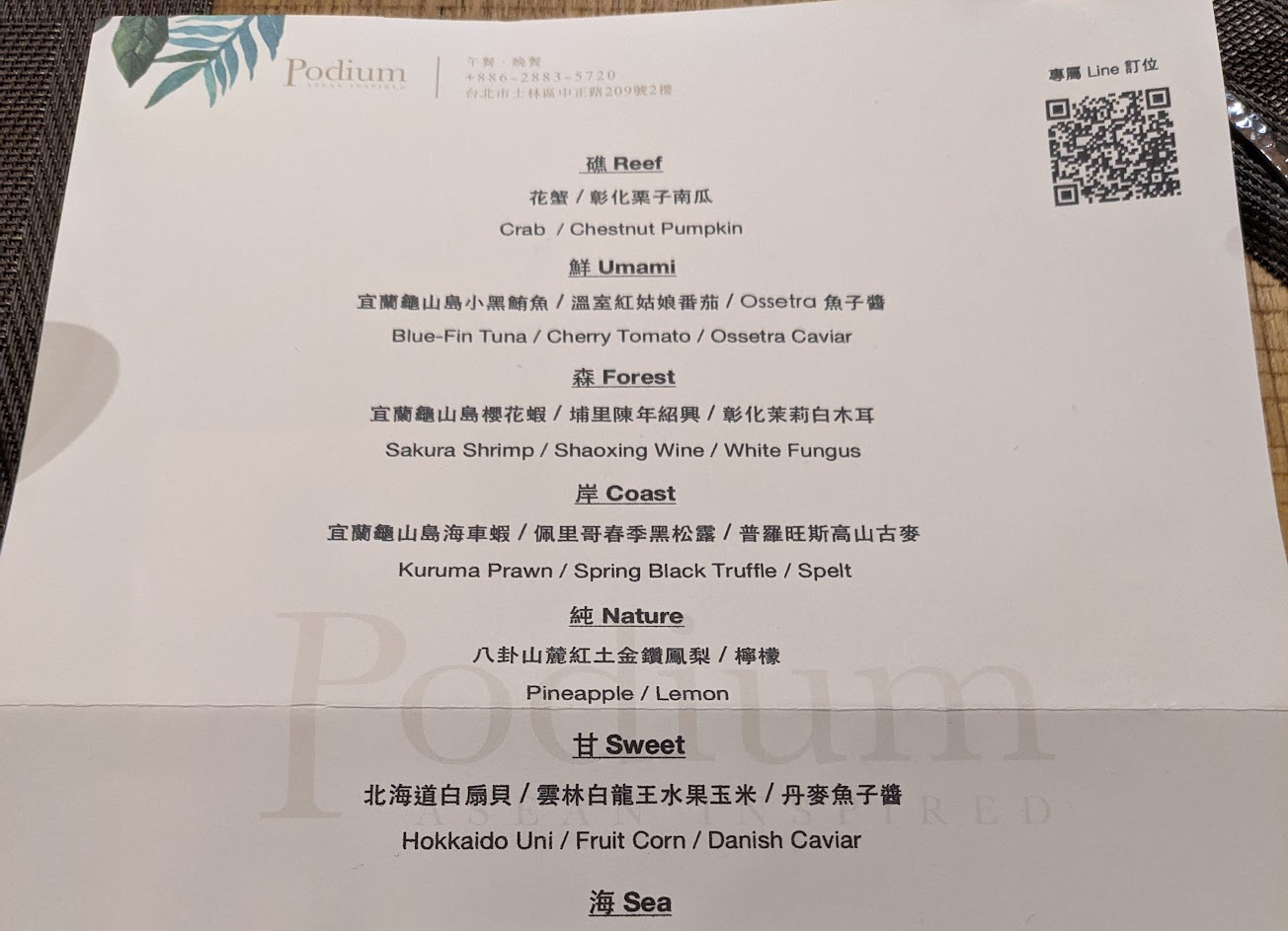 《Podium私廚》法式創意料理與東方食材的結合,過程中每一道菜的食材與製作方式可以感覺出來主廚的用心,透過食材、香料彼此的互補融合,創作如藝術一般的料理。特別喜歡馬頭魚的處理方式,讓熱油燙魚的表皮使魚鱗焦脆香氣四溢!還有一個很特別的雞胸肉柴魚,配上台農馬鈴薯泥和日本小川海膽,也是一個完美的結合!