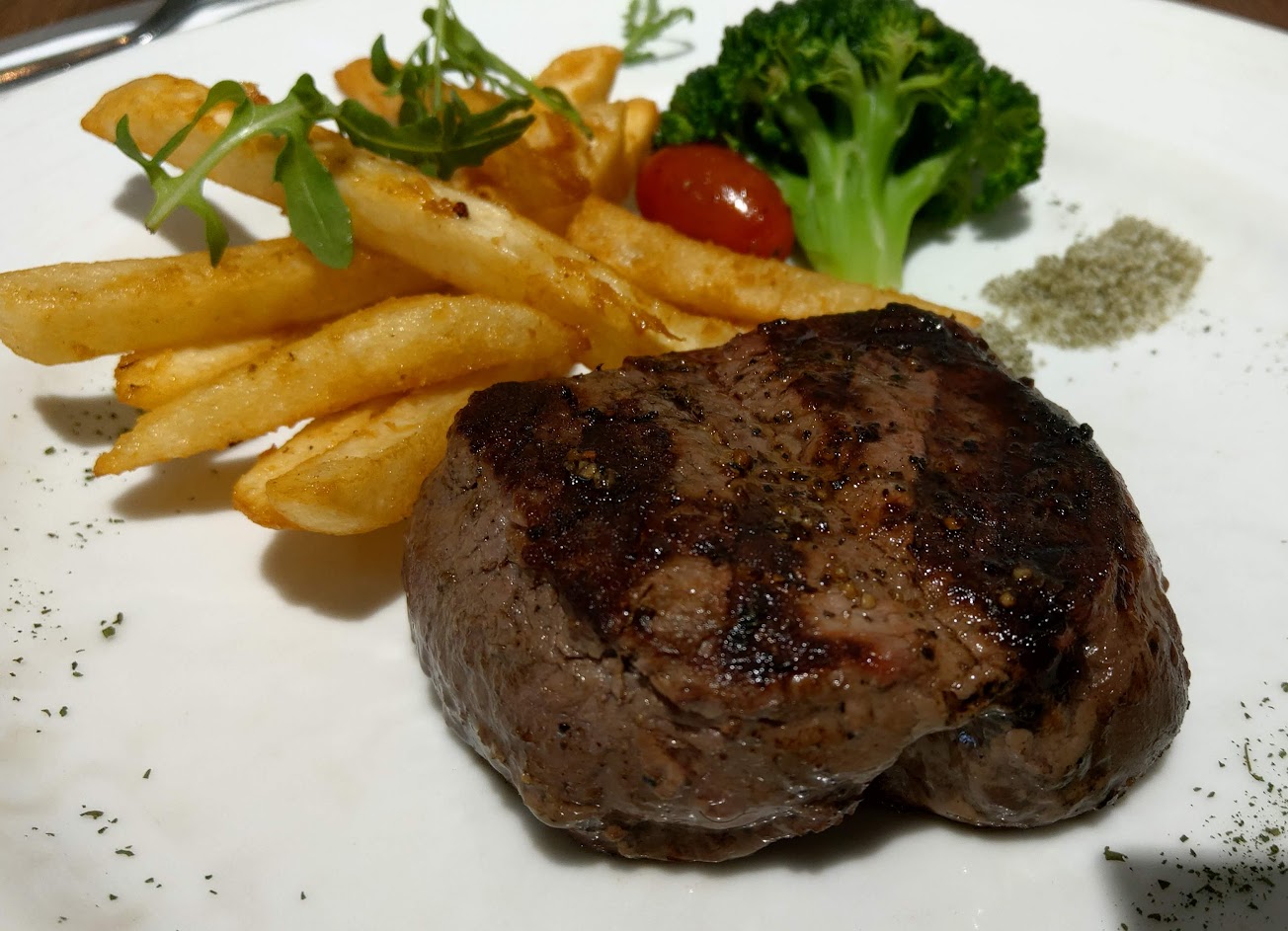 主菜點的是10oz的肋眼牛排,師傅的功夫很好,即便五分熟也不會血水滿盤,也細心的把瓷盤熱好,讓牛排不會失溫。要說缺點可能就是配菜的薯塊太少,能多一些會更好。
