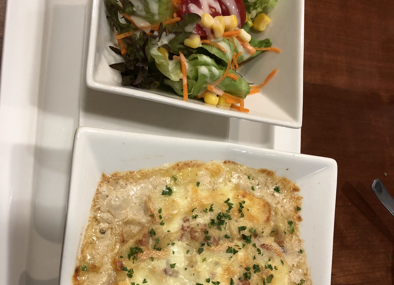 朋友點香濃起司烤餅跟培根焗烤手工垛麵,非常奶味,如果不愛吃奶的人,會覺得膩