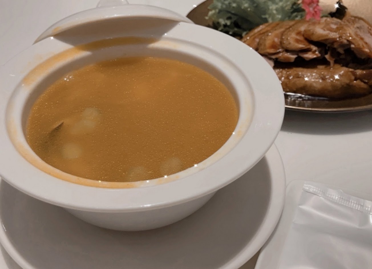 我自己喜歡這二道 ❤️萬麗片皮鴨(一鴨二吃) 我們搭配鹹菜燉鴨湯 (私心很想點足料老火煲靚湯) 貼心的將餅皮放在蒸籠裡面 餅皮有20片因此沒有再點炒飯 不會因為拿出來久了而冷掉 烤出來的顏色超美 因為疫情的關係師傅在裡面片鴨 還是可以看到師傅精湛的刀法 ?老饕吃法記得跟服務員要白糖 餅皮烤鴨配上小黃瓜以及蒜苗與特調甜麵醬捲再一起入口 真心幸福