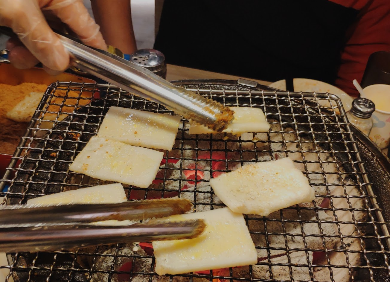 淋完滿滿的醬油之後大姐還不忘提醒我們可以再加鹽巴!(要多鹹)然後就很有節奏地拿著夾子敲著鐵網幫我們烤肉片,彷彿置身朱宗慶打擊樂團的音樂會,直到朋友說了幾次我們自己烤就好了才結束了演奏