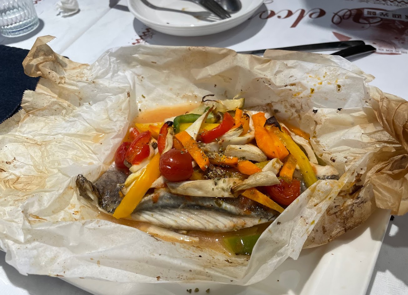 這次點的餐點是 慕沙卡、烤雞、烤魚、松露燉飯、海鮮義大利麵