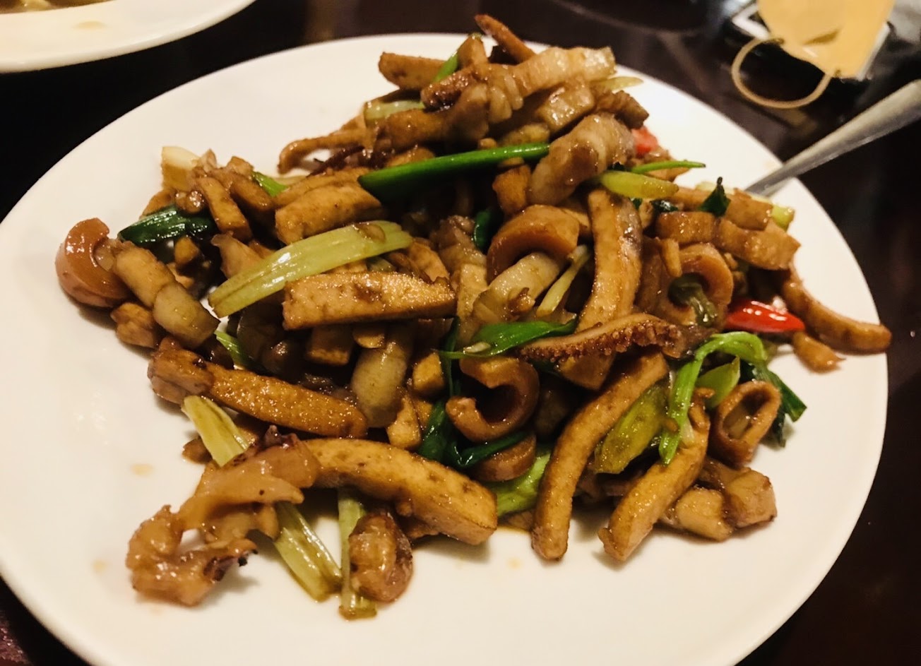 洪樓小館的蔥油雞,雞肉切片厚薄得宜,入口咀嚼的肉感很紮實;蔥油的部分也是滿滿的蔥香氣,相對的油感不會過於厚重,也因此,幾乎是大家都很喜歡的一道料理。