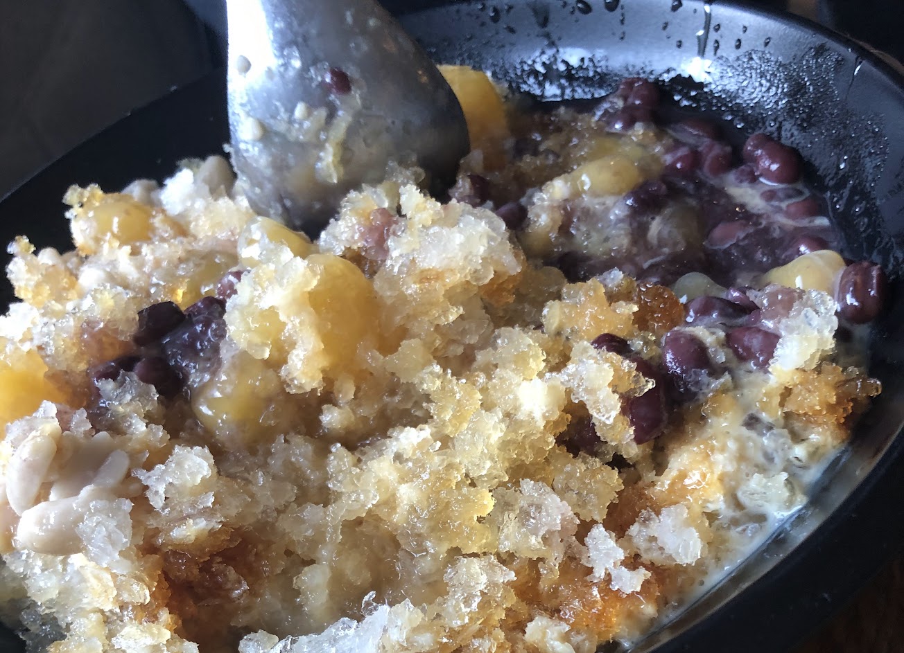 六種料,挑豆花、芋圓、花生、芋頭、紅豆、粉圓。剉冰冰粒比較大顆,咬起來會稍微有喀拉喀拉感。黑糖水的甜豆跟香氣都很好,必需要稱讚一下,糖水給的分量很剛好,從上到下的剉冰都有充分浸潤到糖水。豆花的黃豆香味討喜,下次來單吃豆花?? 芋圓的蕃薯粉可能過多,吃起來過於Q,香氣稍稍不足;花生有點軟,非常香,喜歡; 芋頭也夠軟,裡面的芋頭本身甘甜也很明顯;紅豆粒粒分明,夠甜入味;粉圓也還可以。整體配料跟剉冰都算是不錯,可以感受到對於配料的用心處理,5.5分。