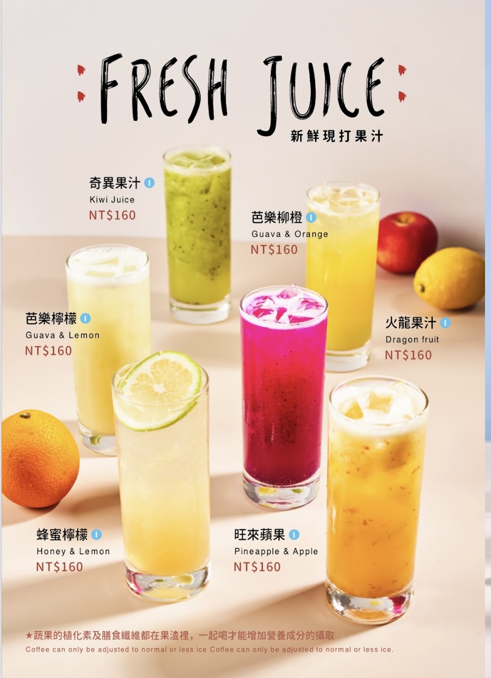 果汁都是新鮮現打的,服務生態度良好,顏值高