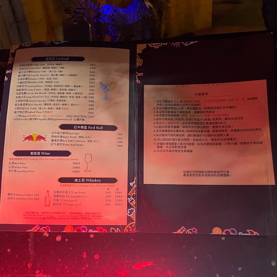 而店家採先點餐後付款,每人低消$280元,另有1成服務費。而菜單選擇多元,炸物、火鍋、義大利麵、披薩、鬆餅、冰淇淋、茶葉茶、花草茶、酒精飲料、調酒皆有,甚至還有水煙。今天2人點了: