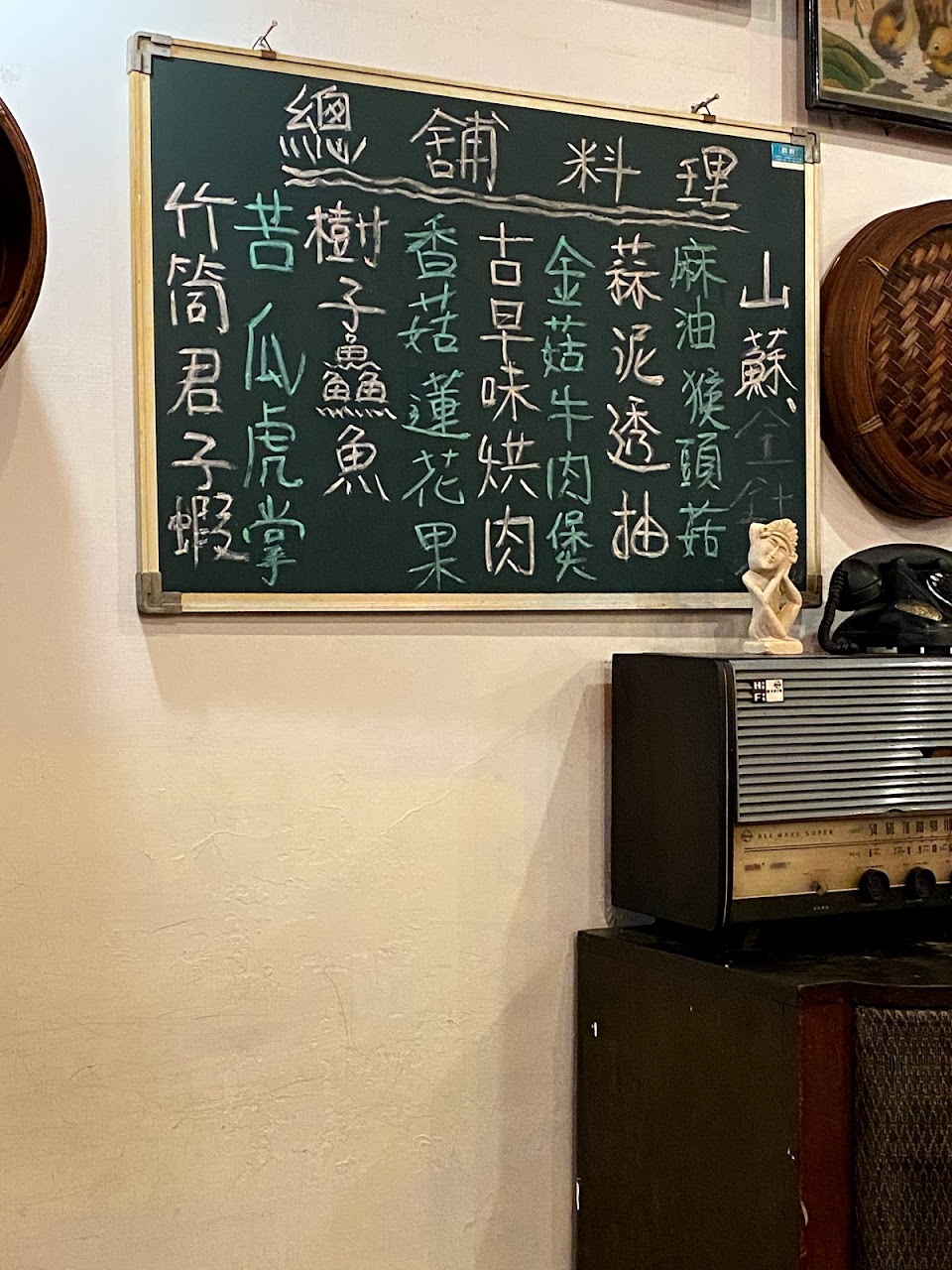 搭配各種不同而且有年份的擺飾:老爺鐘、交趾陶、竹編蒸籠、真空管收音機、老電扇、老映像管四根腳的黑白電視機、牆上的牛軛、黑色轉盤式電話機、腳踩的縫紉機(應該也是勝家牌縫紉機,以前有錢人家當嫁妝會列入)…etc,其他東西不勝枚舉,桌椅全都是類似紅木傢具的棗紅色,裝潢到處洋溢古色古香的氣息,還穿插擺設古早味的零食,過足上年紀的人回味往事。