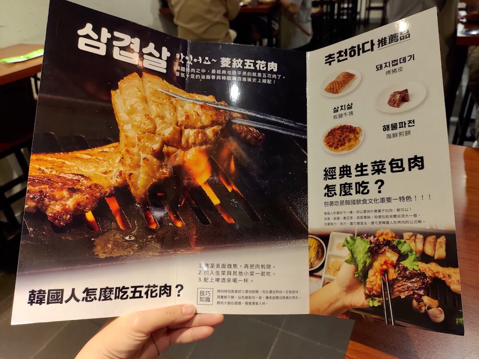 建議一定要事先預約,避免撲空。第一次在此用餐,感受到服務非常細心,上菜時也會告知不同肉品需要翻面的時間,告知怎樣的烤法最好吃並桌邊協助剪切肉塊,大腸跟豬皮都有事先滷過,可以選擇加熱吃或是煎的焦黃香脆再吃,原味五花肉肥嫩多汁,蒜味五花肉可以翻炒的吃就很入味。 服務 內用 餐點類型 晚餐 平均每人消費金額 $400-600 餐點:5 服務:5 氣氛:5 建議的餐點 黃豆芽 海鮮煎餅 石鍋拌飯 大板條牛肉 小菜 海鮮煎餅 大條牛肉板 小菜 肥腸 烤節瓜 辣味菱文五花肉