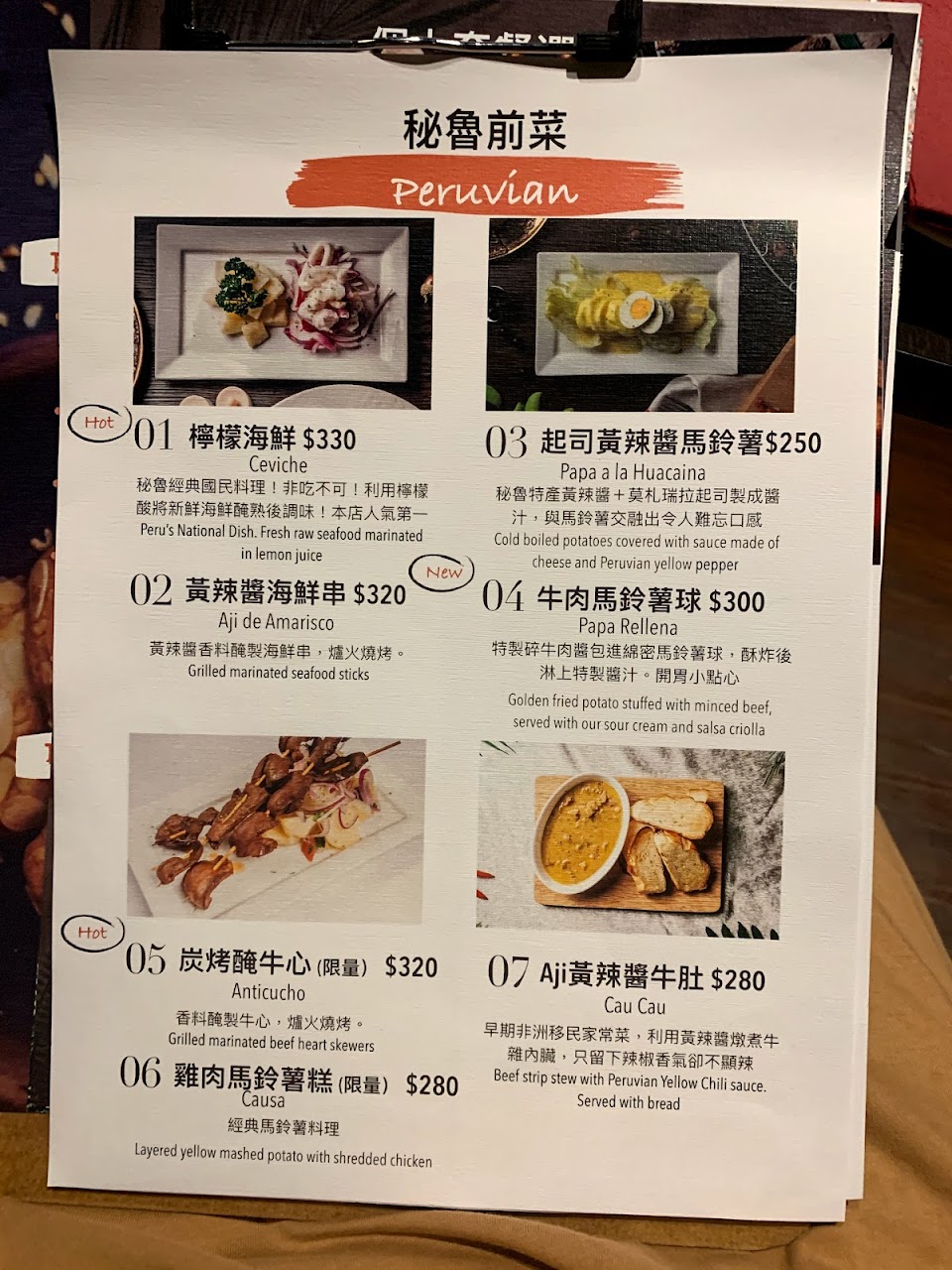 很有異國氛圍的餐廳,餐點口味特別,而且份量十足,女生大部分吃不完一個主菜。他們推薦的料理都蠻棒的,反而秘魯烤雞的表現沒有特別驚艷,可能我不喜歡雞胸肉吧?