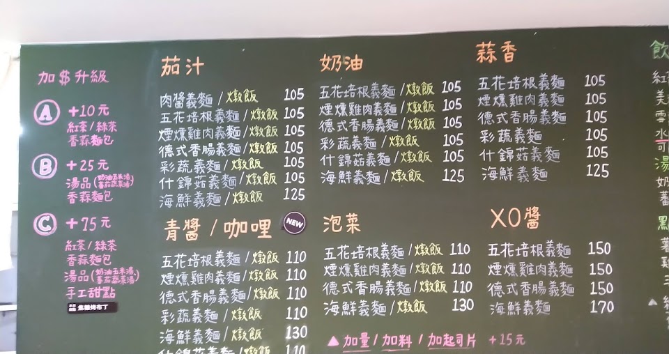 兩次的餐點蒜味培根和青醬雞都不錯,整體口味偏台式、偏濕,配料較少,但100初頭的價位在天母也沒什麼好挑剔的。