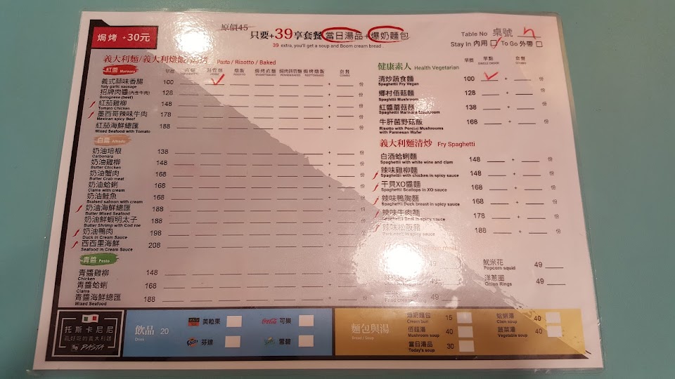 意大利麵份量很夠, 味道不錯, 加39元變套餐湯很一般+一個麵包. 不太值的得加購.