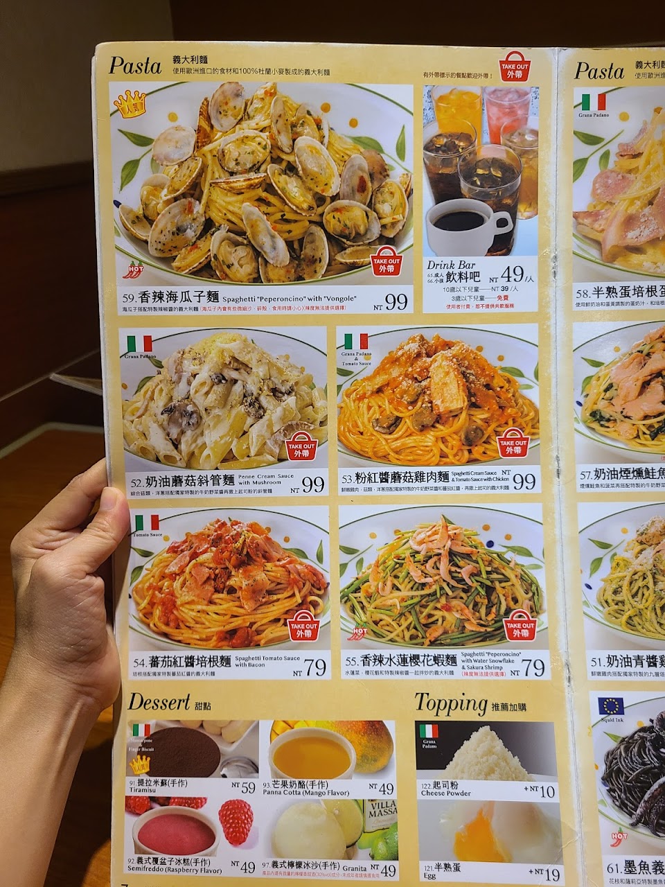 義大利麵平價好吃,還有加價無限暢飲咖啡、茶等。一個人花百元價即可悠閒用餐閱讀,受居民學生喜愛。
