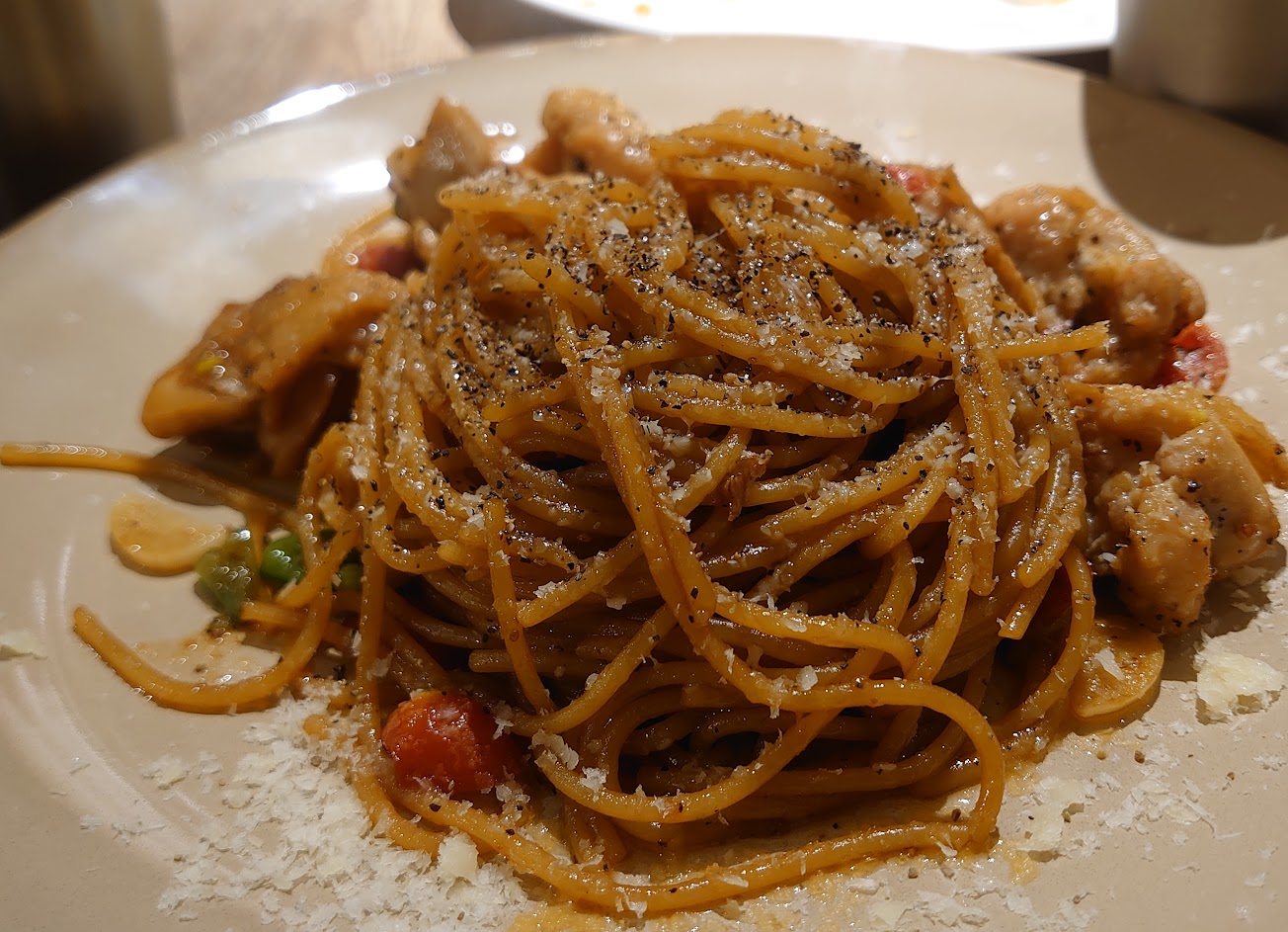 辣醬魷魚pasta非常順口、夠味,番茄和辣醬、魷魚好搭,海苔酥增加多層次口感,畫龍點睛,雞肉甜豆醬油pasta味道比較淡,但雞肉很好吃,不收服務費很棒