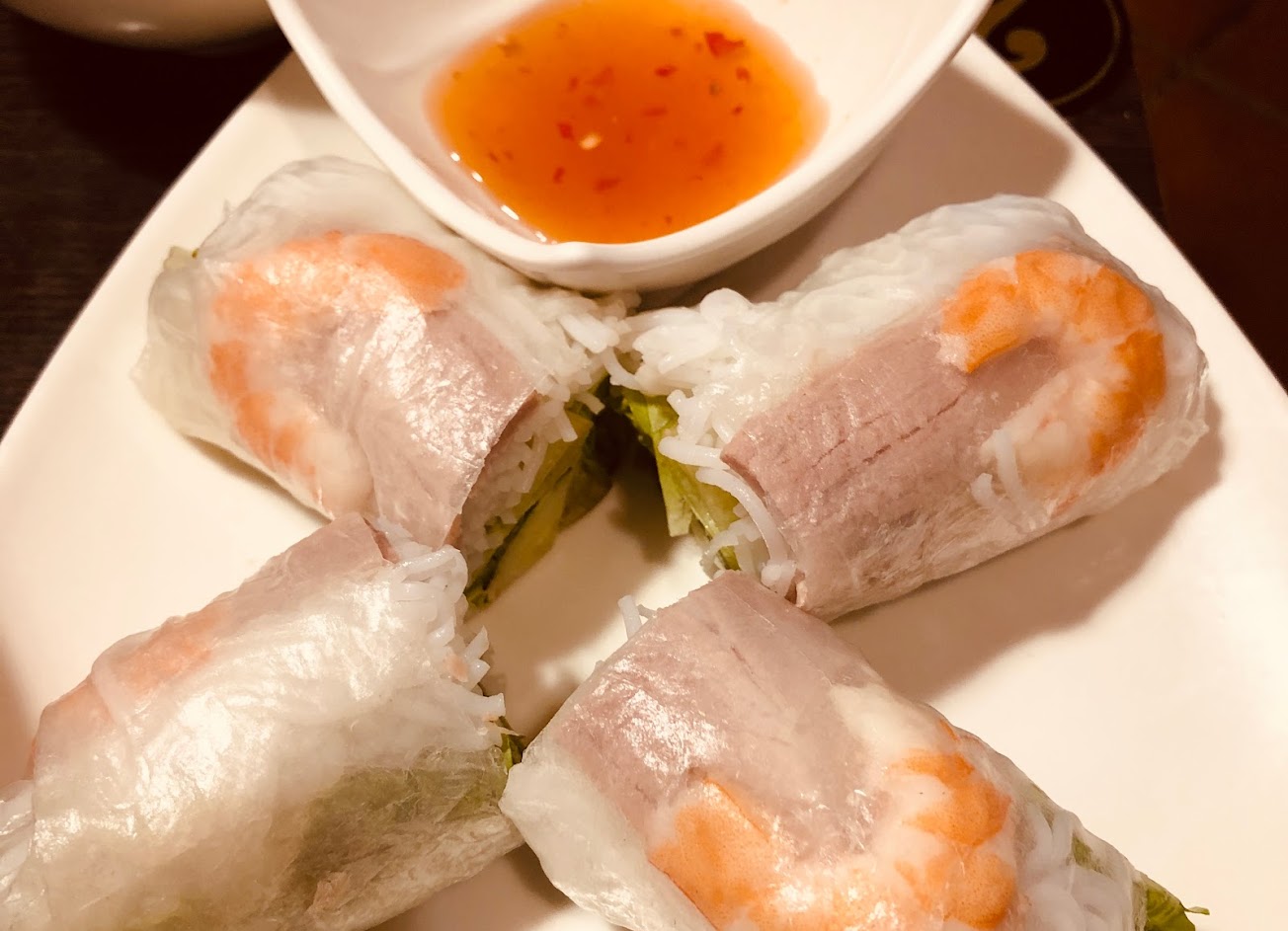 點了招牌牛肉河粉,調味鹹淡剛剛好,河粉搭配湯非常好吃,但牛肉薄片太硬了,牛筋跟牛肉相當軟嫩,很好吃,在涼涼的天氣來上一碗,非常過癮;這次還點了生春捲,內含一整隻蝦和肉片,米線吸滿酸甜的醬汁,非常開胃,如果已經點主食可以跟同行的人一起分食,不然這樣份量會太多。
