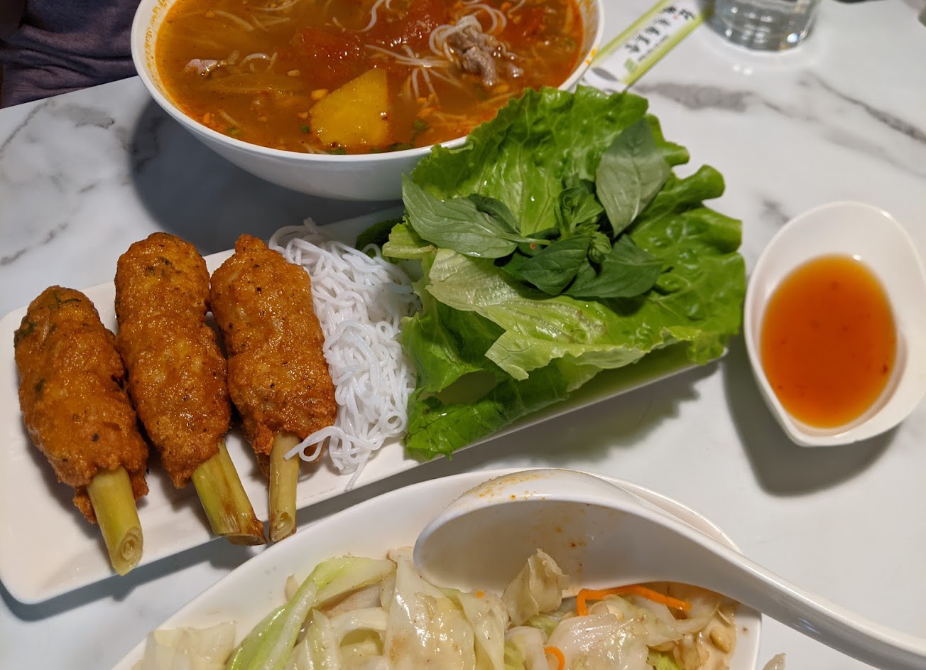 我們點外帶,分別是薑黃炒飯和牛肉米線。薑黃炒飯很香,有淡淡的薑味但很順口,牛肉米線的湯頭很夠味。兩道的用料都實在,價格合理(比普通小吃貴,但以特色美食來說是便宜的,他的品質絕對對得起價格) (我沒有很懂越式料理,無法就道地程度評論,但台灣人的口味應該會喜歡)