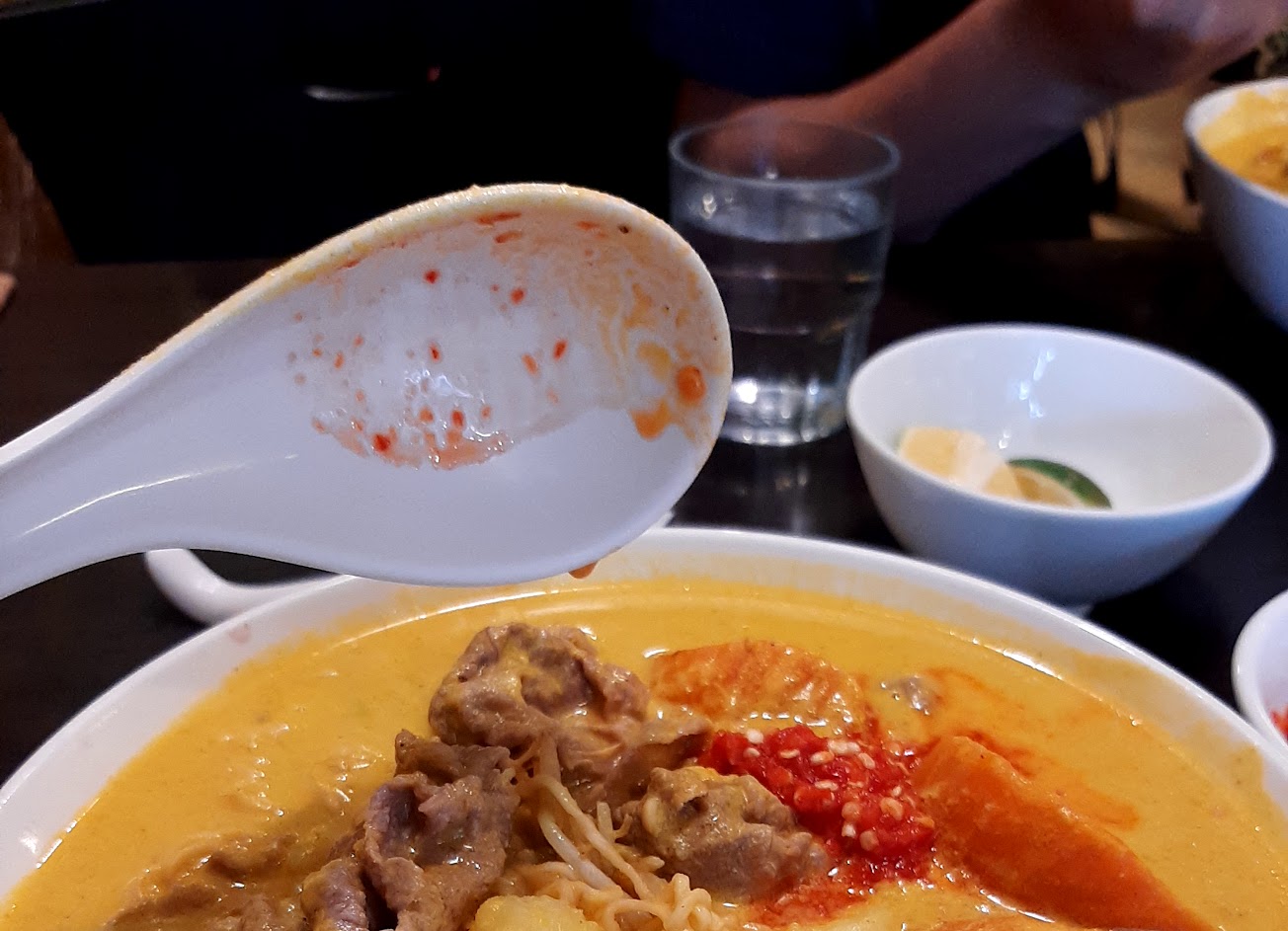 清手機照片,看到2021年5月疫情前的咖哩牛肉麵,還記當下感覺就是甜甜甜甜有的南洋味,然後第二印象是吃很飽。朋友則是說,陪老婆到醫院,順便吃過,那次是二訪,但我覺好甜啊,而且在一間在醫院對面生意非常好、桌子擦不乾淨的食館吃飯,算是南洋甜吃飽系食物,馬鈴薯、紅蘿蔔、肉很多,但太甜我不愛