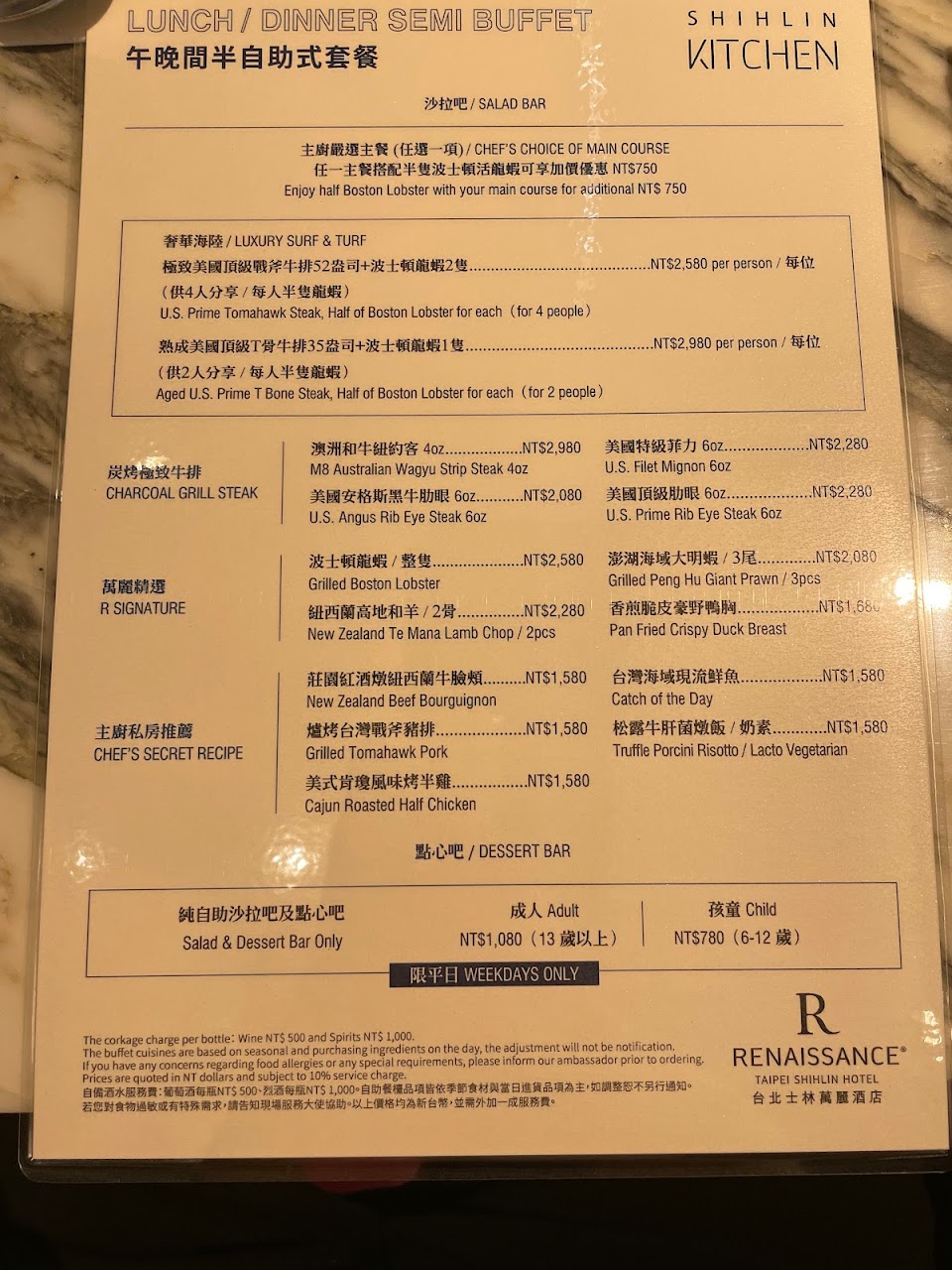 萬麗酒店的士林廚房:早餐雖然花樣沒那麼多,但是精緻好吃,來住宿一定要加購。晚餐時間剛好遇到『開工大確幸』的優惠活動,千元主餐買一送一,又可以吃其他的沙拉吧。