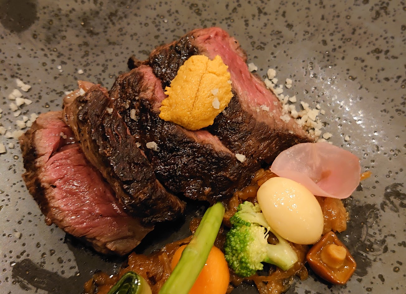 和牛橫隔膜/北海道馬糞海膽/烏魚子紫蘇鹽