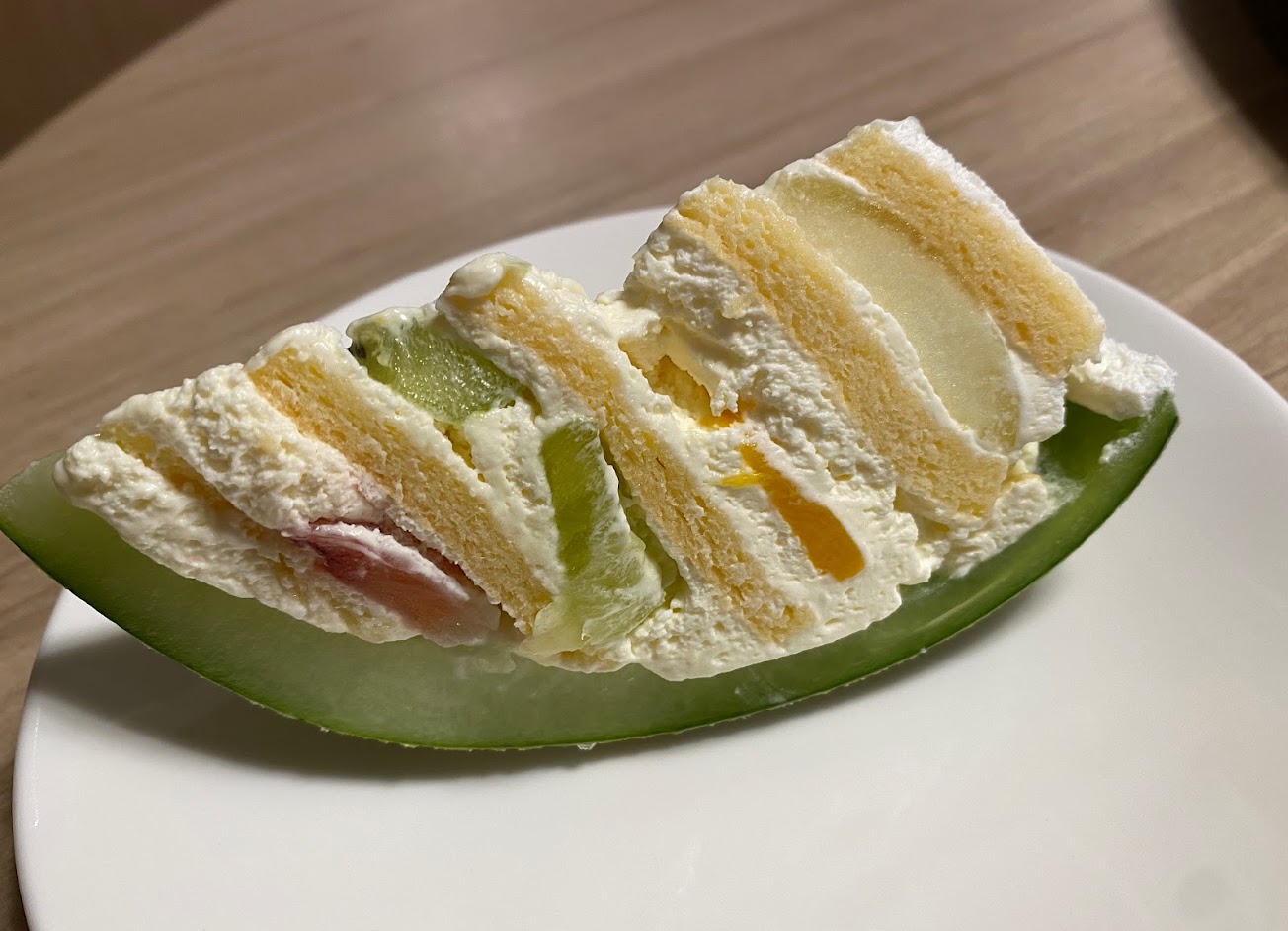 外觀是哈密瓜, 裡面是水果蛋糕, 真的是太有創意了. 味道也好吃, 不會太甜或太膩