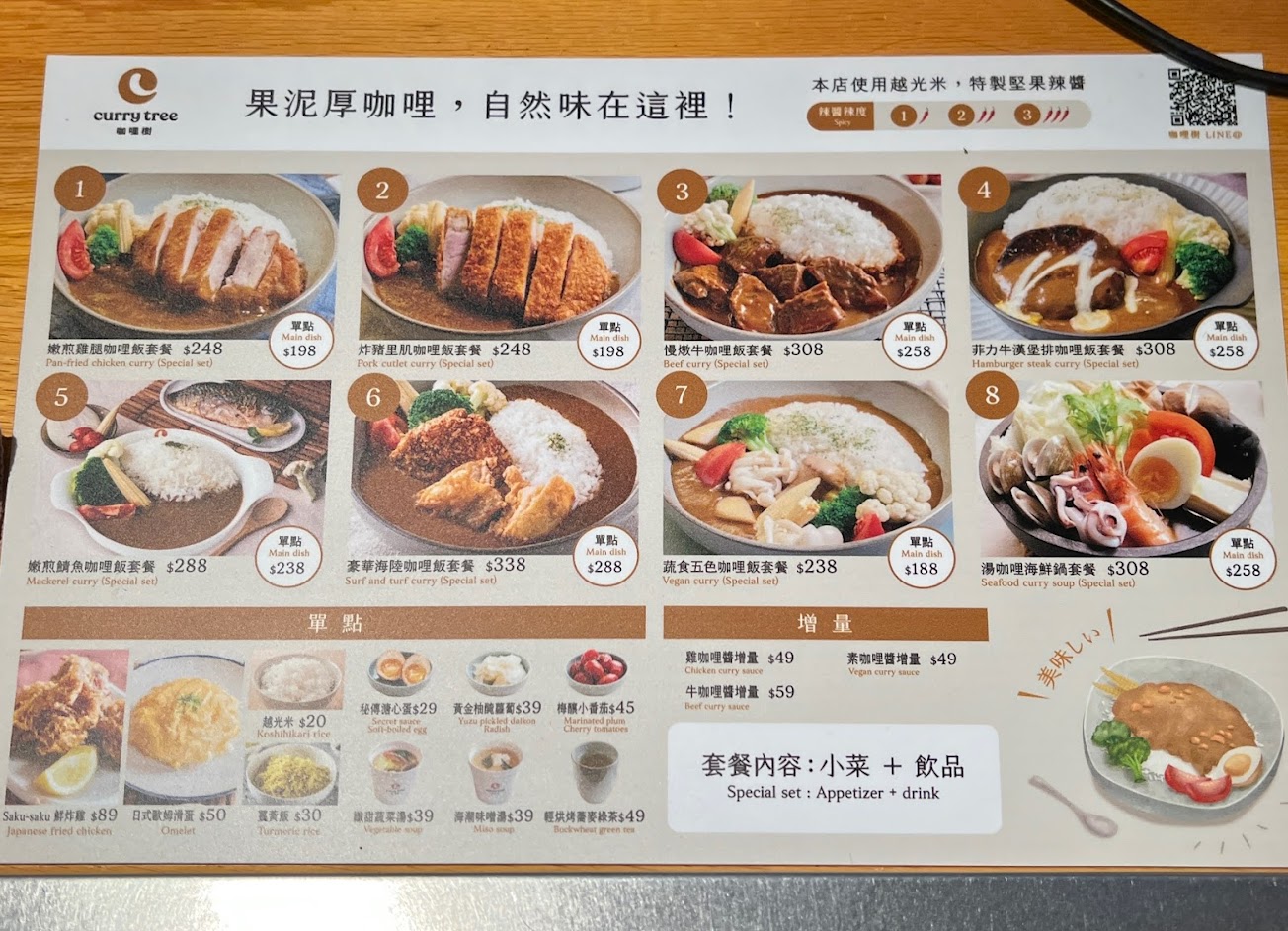 咖喱本體是好吃,但優惠的套餐小菜飲料沒得選,點完了才知道飲料沒了直接未告知就換蔬菜湯,小菜是梅子番茄,同行兩位友人包含我都不吃(如圖),加上白飯上又一個牛番茄,蔬菜湯裡又有番茄,都無法吃,這頓套餐實在不太過癮…,咖哩醬也給很少
