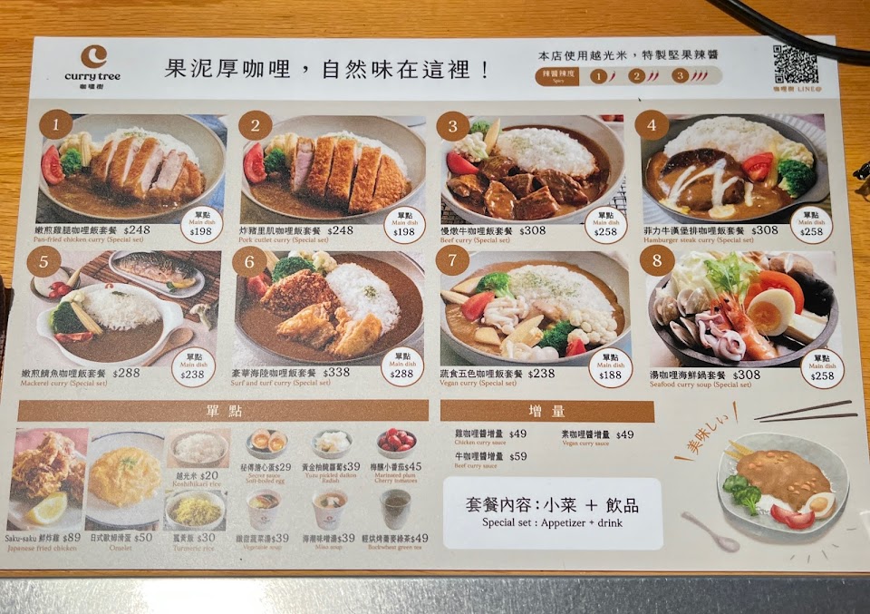 咖哩樹的咖哩是濃郁日式咖哩 有果泥 好吃 服務 內用 餐點類型 晚餐 平均每人消費金額 $200-400