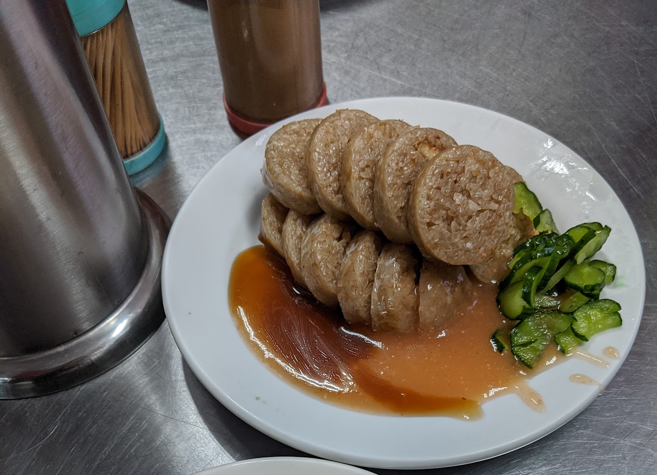 今天吃了大腸煎跟三絲丸湯。 首先擺盤,大腸煎上桌這整整齊齊的狀態就是加分,不同於蒸的大腸,本家特色是用油煎的煮法,但吃起來不油膩,糯米紮實外皮煎煮過後口感微微的脆口但不失其韌性,再有小黃瓜跟醬料當配角,真的好吃值得推薦;丸子湯,三絲丸就一般般,但是這湯頭有鑑別度欸,調味很特別,還算好喝喔~ 還會再次探訪店家,準備攻略烤雞腿及香腸!