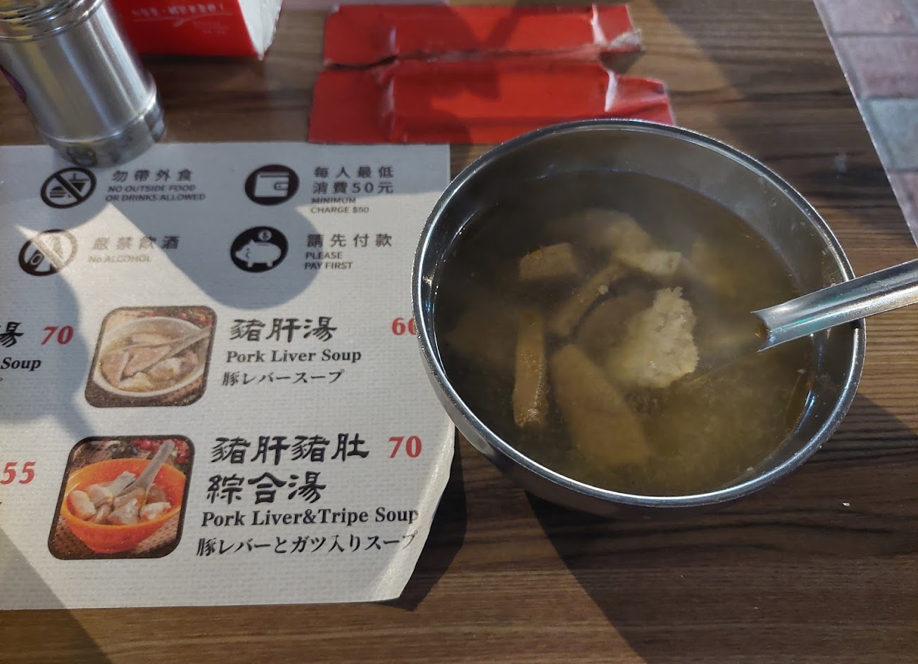 內用要排在後面帆布那裡 有低銷50 一碗$60,裡面有豬肝跟兩塊肉羹 豬肝蠻厚的,口感偏軟,但真的很小碗 外帶給的碗更小