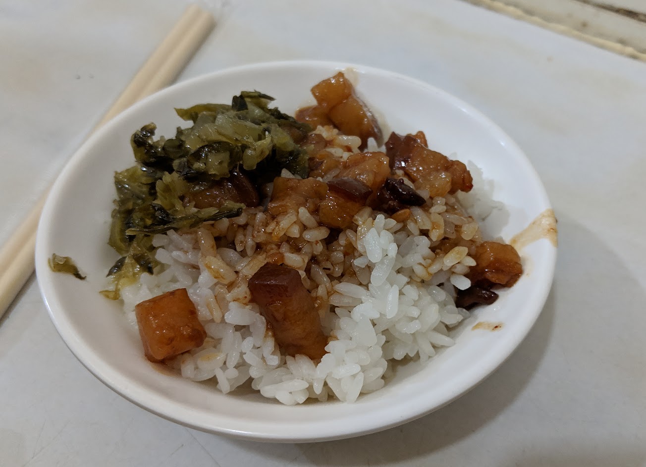 拿滷肉飯來說,肥而不膩的槽頭肉搭上鹹菜更增口感,但美中不足是滷肉湯汁變少了,米飯口感也乾了,滷肉飯入口時黏嘴感及香氣減少許多(這是四顆星變三顆的主因。
