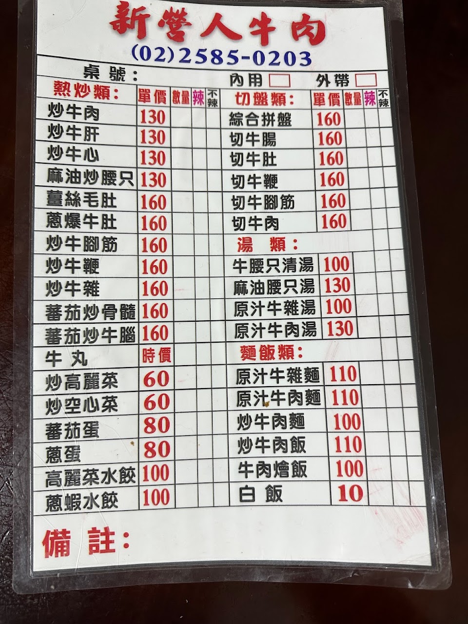 點了炒牛肉、牛肉炒麵、牛肉燴飯 炒牛肉份量偏小(但在台北沒吃過別家無法得知份量水平) 炒麵的麵偏軟, 燴飯是白飯上淋上炒牛肉,沒有和在一起,跟評價上看到的不一樣。 炒的醬汁味道不錯,算有一點台南口味(不是偏甜的那種)