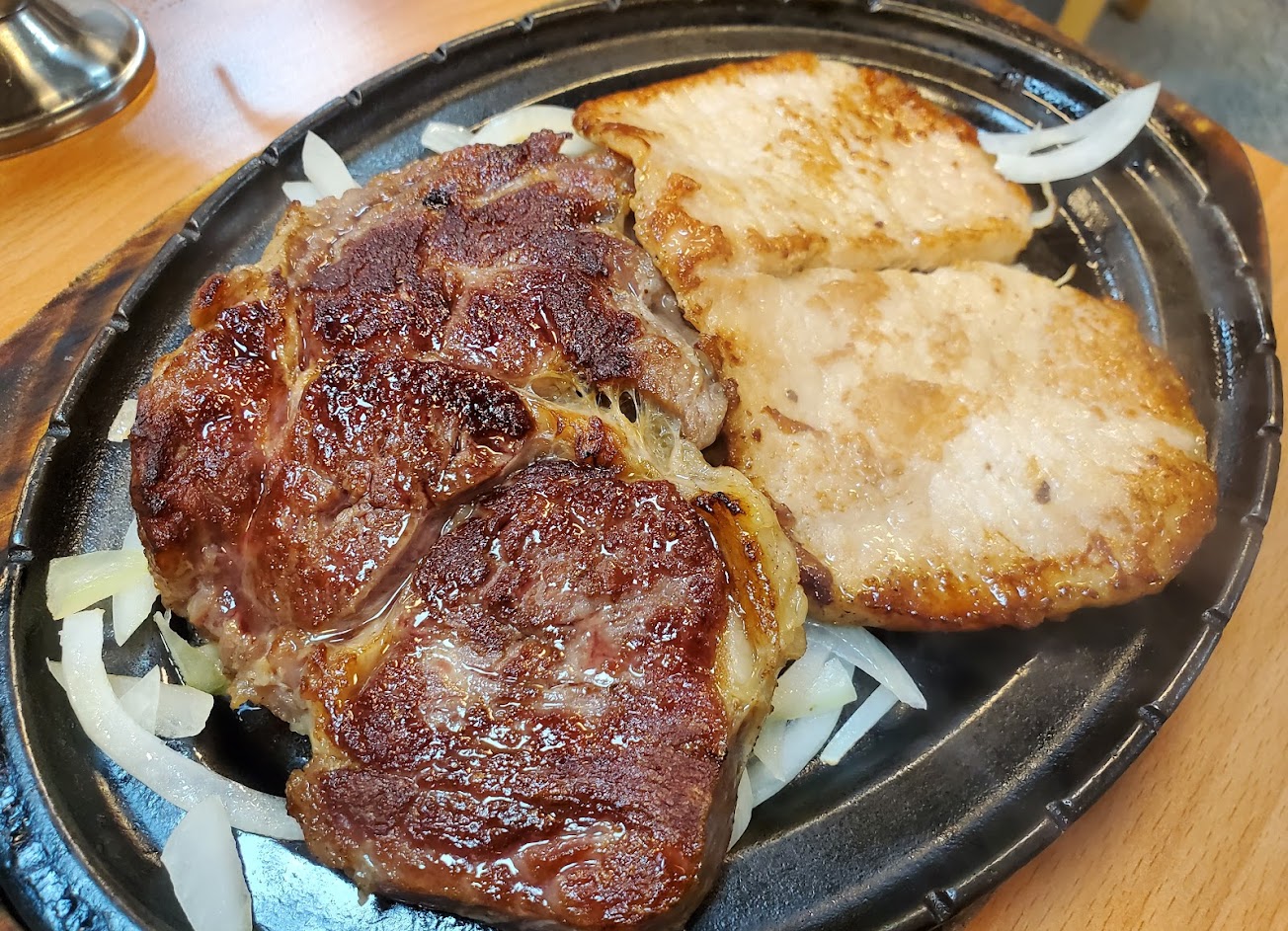 本來以為由露天改為有店面且新裝潢會有不一樣的消費環境,但來消費後結果跟所有平價牛排館都一樣有的通病,就是為了有半開放式的廚房而捨棄了乾淨清新的空氣品質,這家店2樓也有雅座但是還沒上去過所以不知道2樓的空氣品質是否一樣的糟糕,反正來用餐要有心理準備會帶著一身的油煙味離開。餐點部分鐵板麵份量十足就算加麵也只要10元,厚切沙朗肉的份量還算大片,肉質的話就口感有點奇特感覺軟嫩QQ的,其他如玉米濃湯&飲料(紅茶)都是無限享用的,店家採半自助經營所以餐具、濃湯、飲料都是自行取用,佐料沾醬一樣有黑胡椒醬、蘑菇醬&綜合醬,但如果不喜歡沾醬的話在店家的自助檯上除了有濃湯用的黑胡椒粒也有玫瑰鹽可供使用。還有服務人員態度很好不會因為人多而顯得不耐煩的表情等,總之比起附近的平價牛排館算是不錯的了。