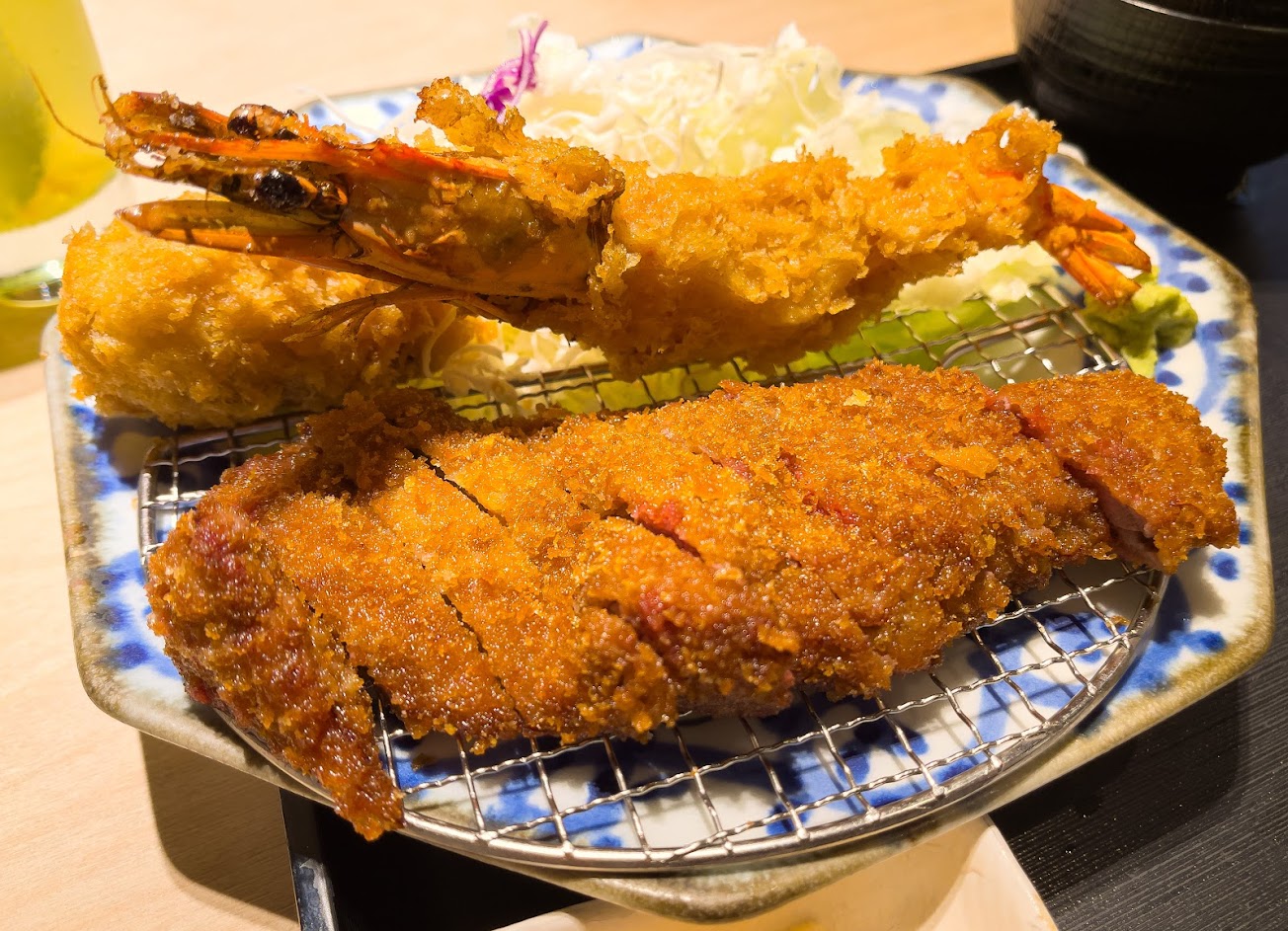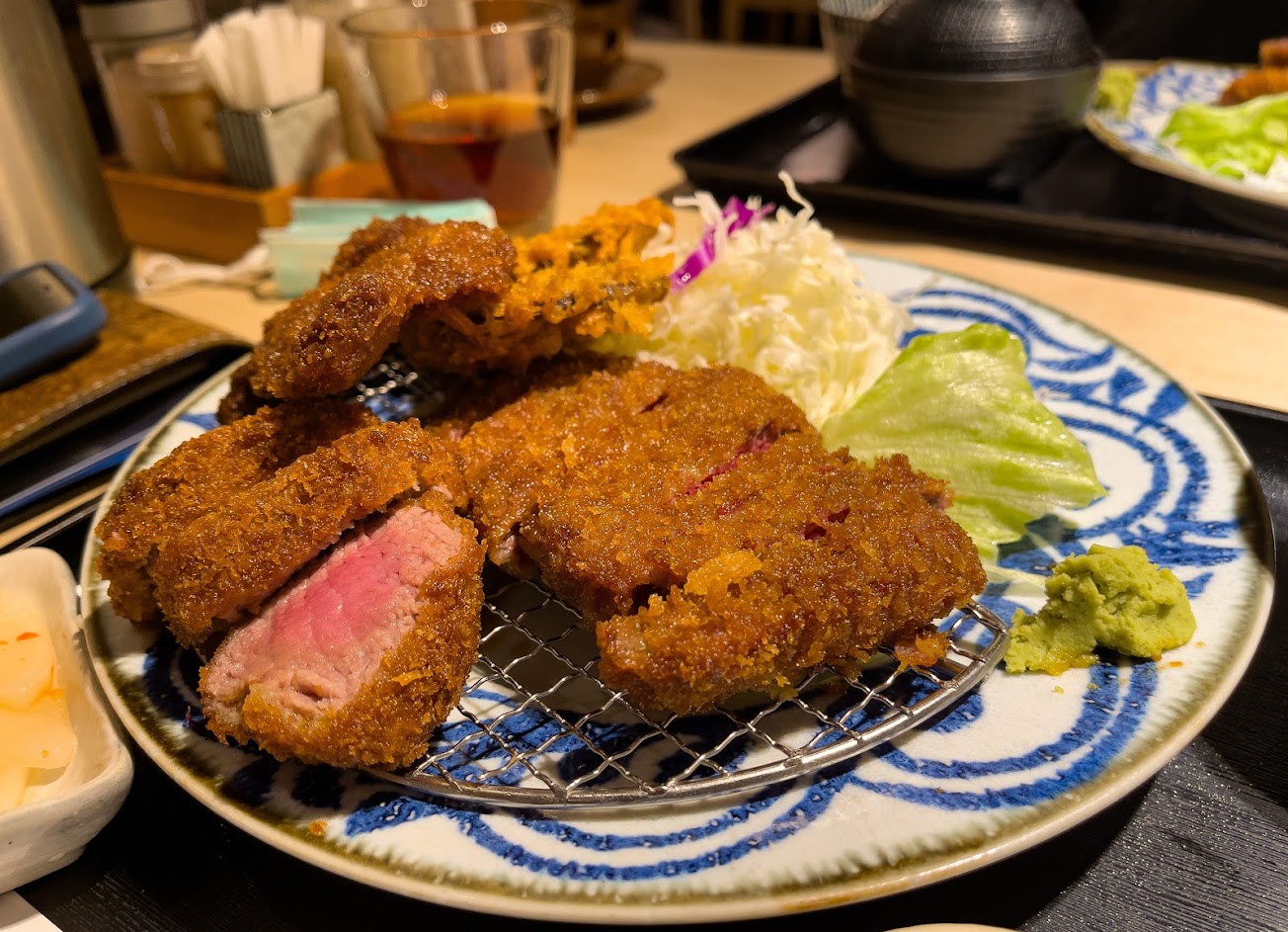 與朋友去吃看看炸牛排到底長什麼樣子 於是來到了這間店 我點的是海陸套餐 旁邊附了三種不同醬可以沾 炸皮跟肉黏的相當緊密 酥脆的外皮搭配上牛肉的軟嫩 真的很不錯 但最讓我驚艷的還是炸牡蠣 鮮味炸彈直接在我嘴裡噴發 炸蝦也不會像其他店皮很厚但蝦子很小 他們真材實料 蝦子真的大也很Q彈 而M7澳洲和牛厚切真的有夠大塊 很嫩但偏生可以請店員點烤盤烤熟一點 肉汁噴發真的很爽 醬汁不推薦沾咖喱 會讓肉的味道完全消失 就是不搭 不過拌飯倒是不錯 甜點很有日本味 整體來說還算不錯 不過真的有點偏貴