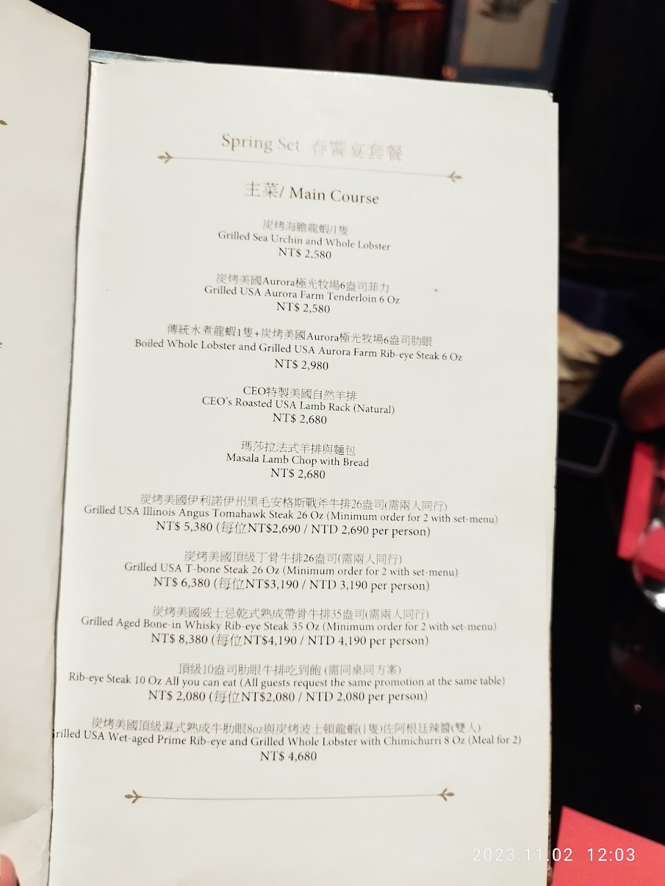 服務員每位服務都很棒,尤其是Mandy(不知道有沒有拼錯)服務真的很棒,在主餐菲力牛排和戰斧牛排上菜時,我們都要求再幫我們熟度上的調整時,臉上沒有不耐煩和不悅的表情