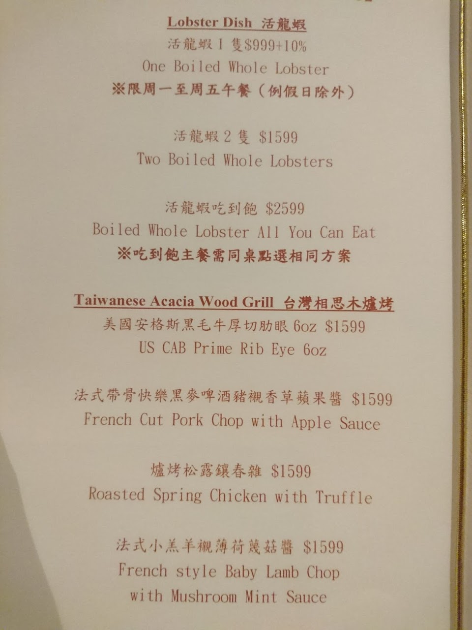 晚餐非常豐盛又好吃,超級飽!吃整隻龍蝦?很過癮,而且遇到超讚的友謙,幫我們桌邊火速剝龍蝦,太棒了~~~有些信用卡有五折優惠,搭配起來物超所值! 餐點:5 服務:5 氣氛:5