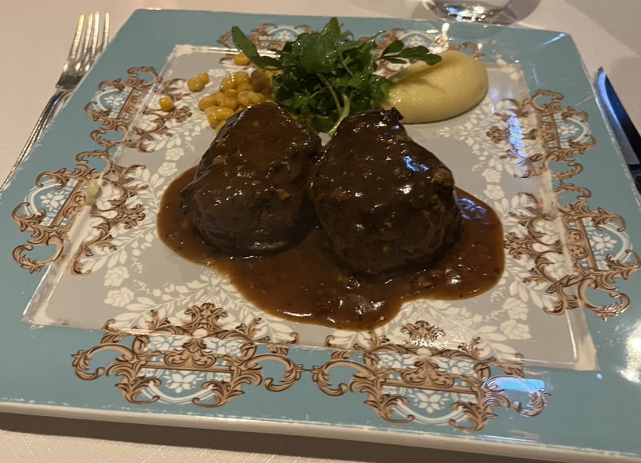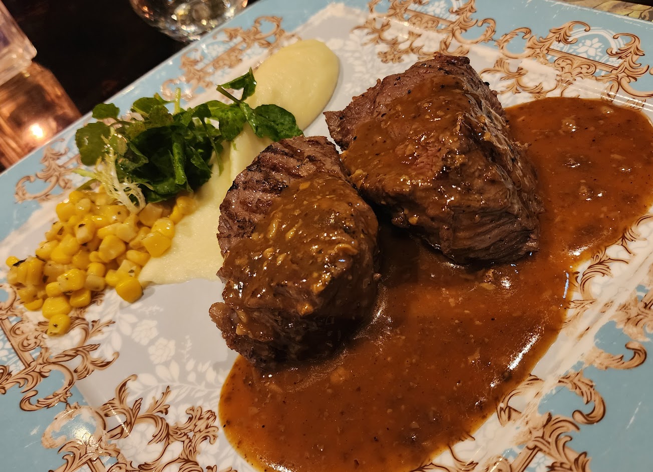 以價位來說,牛排味道ok,餐點最讓人驚艷的反而是湯和咖啡和甜點。另外服務員非常厲害,只有少數幾個人可以全場跑,最後結束時還要帶客人去搭電梯,服務非常到位