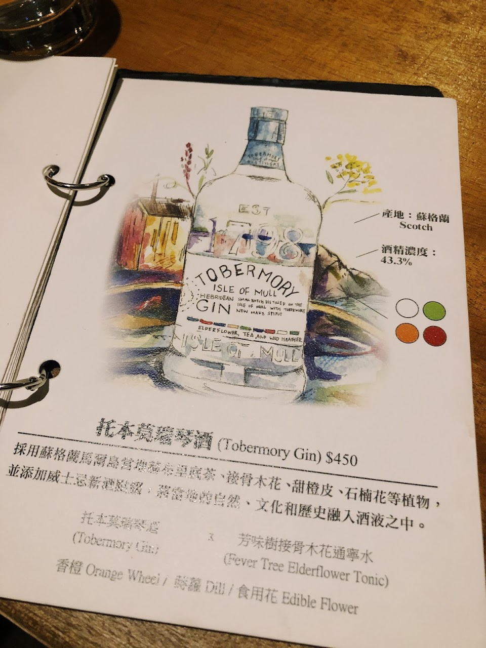 菜單也很有意思,根據琴酒「酒中香水」的美名,將各種「香調」以顏色區分,每隻酒單上的琴酒以不同顏色標註,表示帶有該顏色的風味。