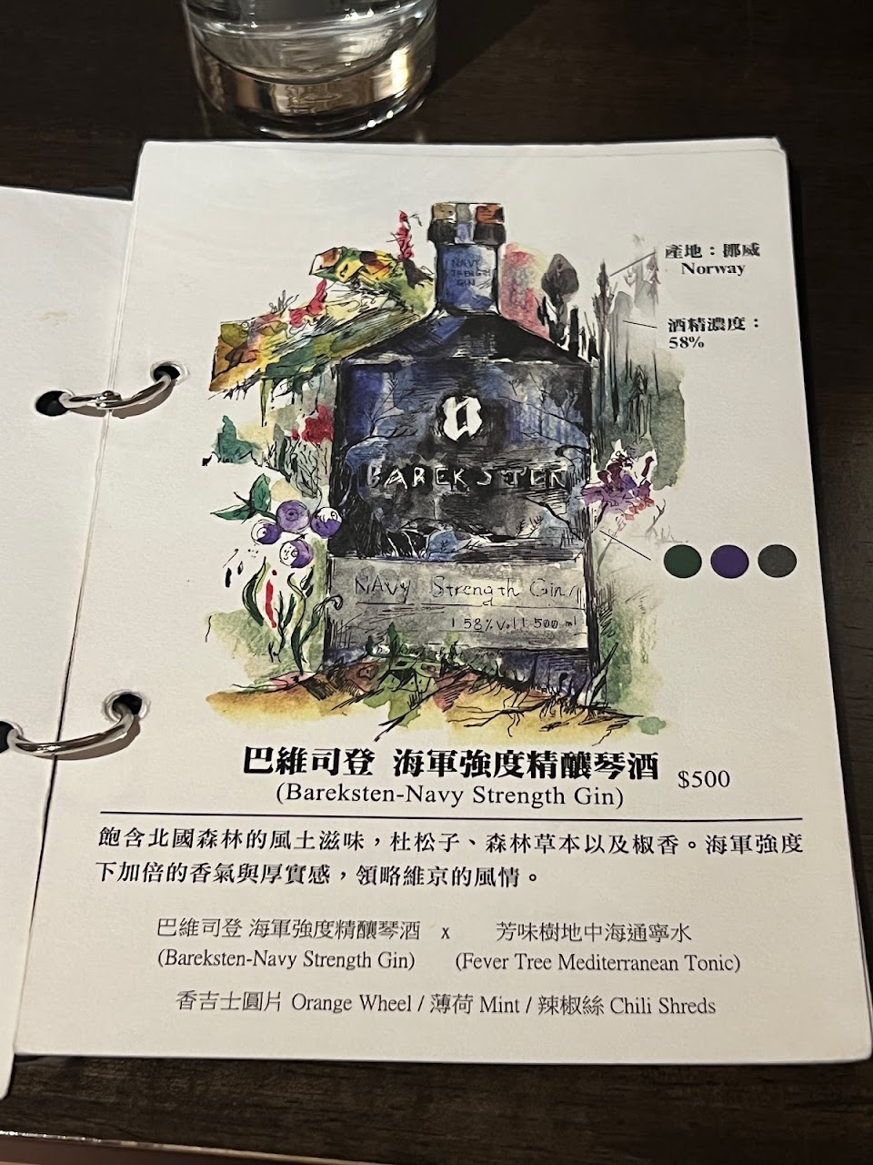 菜單也很有意思,根據琴酒「酒中香水」的美名,將各種「香調」以顏色區分,每隻酒單上的琴酒以不同顏色標註,表示帶有該顏色的風味。