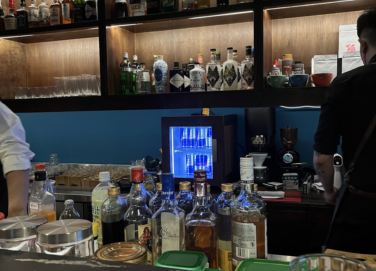 店家是新開幕的,有支援信用卡付款(這個加分,有太多都只收現金)店內氛圍非常好,有吧台(大約可容納10-15人左右,沒細看),也有桌位區。服務方面我覺得很到位,招待快速態度也很好,隨時都會幫我清掉空的酒杯,也會馬上詢問有沒有要再點酒,會依照客人喜歡的酒精濃度來推薦調酒,吧台區桌面上的垃圾也都會馬上做整理,送了一盒奶妹裝的小餅乾(我好喜歡帶回家了謝謝老闆?),還送了我跟我朋友各一杯shot(這可能是第一次有調酒師請我喝shot還跟我對喝的我受寵若驚),列為台北愛店以後會找其他朋友回來光顧!