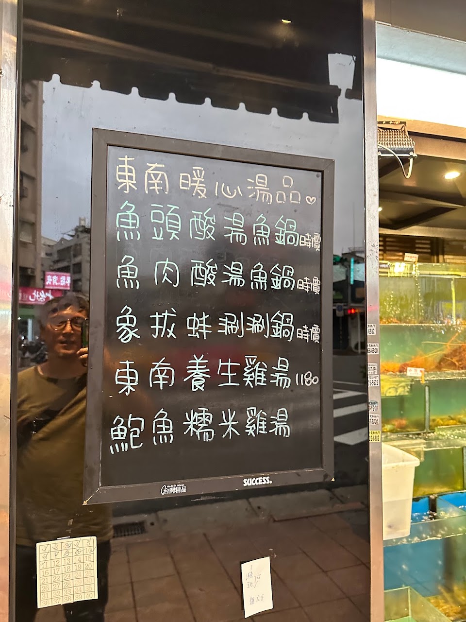 吃了幾十年的感想,近年來大概有10年沒有前來了,這是一家萬華非常知名的海鮮餐廳,早期父親果菜市場幾乎天天前往消費飲酒,海鮮新鮮與價格合理在臺北市來說真的很難得,活海鮮的流動超快,近幾年有開了分店,所以也很少來本店了,今日的桌菜一如以往,只是發現生魚片的盤子很大沒有改變,內容確不如以往了,但是生魚片的新鮮絕對沒話說,冷盤拼盤也略顯的沒太多新意,很多都是買現成的切切擺盤了,裝潢近10年也沒找新,環境整潔真的6.70分左右,連兒童湯匙給的都是髒的,另外因為也是假日客滿,上菜的速度依舊訂了桌菜也等到13:50上最後一道菜+上水果,隔壁好幾間包廂都吃完了,訂桌菜跟現場點菜上菜速度一樣慢………海鮮湯的紅蟳完全沒有刷洗,說真的再新鮮的海鮮沒有處理好,看了就根本不想啃裡面的螃蟹跟喝湯,帝王蟹蓋約2斤多,新鮮(不過醬汁改勾芡的微辣甜醬)真心感覺蟹肉的甜味被醬蓋過了,還好帝王蟹新鮮!然而焗烤草蝦也是以前的多年招牌(幾十年前是明蝦),畢竟物價不同了!酥炸軟殼蟹來的也很晚,炸的不夠酥脆,麵衣微軟,出菜慢趕時間炸功也變差了,擺盤更瞭效了!最後的鯧魚米粉……除了炸蛋酥,鯧魚也炸過,但是一看油都沒瀝乾就丟下去了….整鍋上面厚厚的炸油…..最後水果鳳梨…..竟然鳳梨一看就還沒熟,而且很硬又酸,果菜市場相挺幾十年的老店水果竟然這樣,讓人心寒,希望老老闆能再指點指點!加油吧,我們心中的新東南應該不是這樣而已!