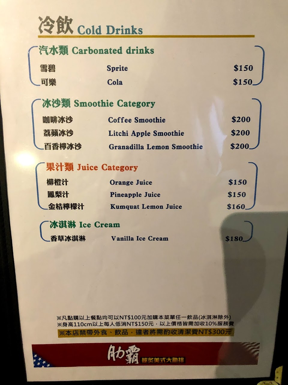 肋排有三個口味,有原味辣味和起司,肋排份量分大小兩種,大份肋排價格是$1880&~$2280,小肋排套餐價格是$1080起跳,以上價格還要加10%服務費。