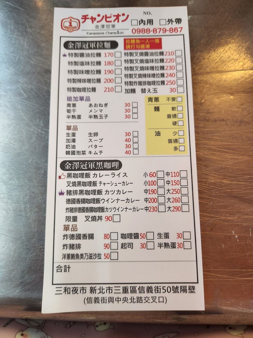 在三和夜市不太起眼的小攤子 拉麵的麵硬的恰到好處 叉燒的肉也是老闆從一大塊肉裡現切的 黑咖哩跟普通咖哩不同 是帶點微酸感 又不會膩口 炸物炸完老闆還會用鐵夾夾著甩乾油 都是現點現做 等待時間也不會很久 老闆感覺是正統日本人 有著日本人的客氣 日本男人的硬氣 第一次吃的時候老闆聽著日本歌 第二次吃的時候老闆跟另一位同事用日語在聊天 二訪還是很愛!! 服務 內用 餐點類型 晚餐 平均每人消費金額 $200-400